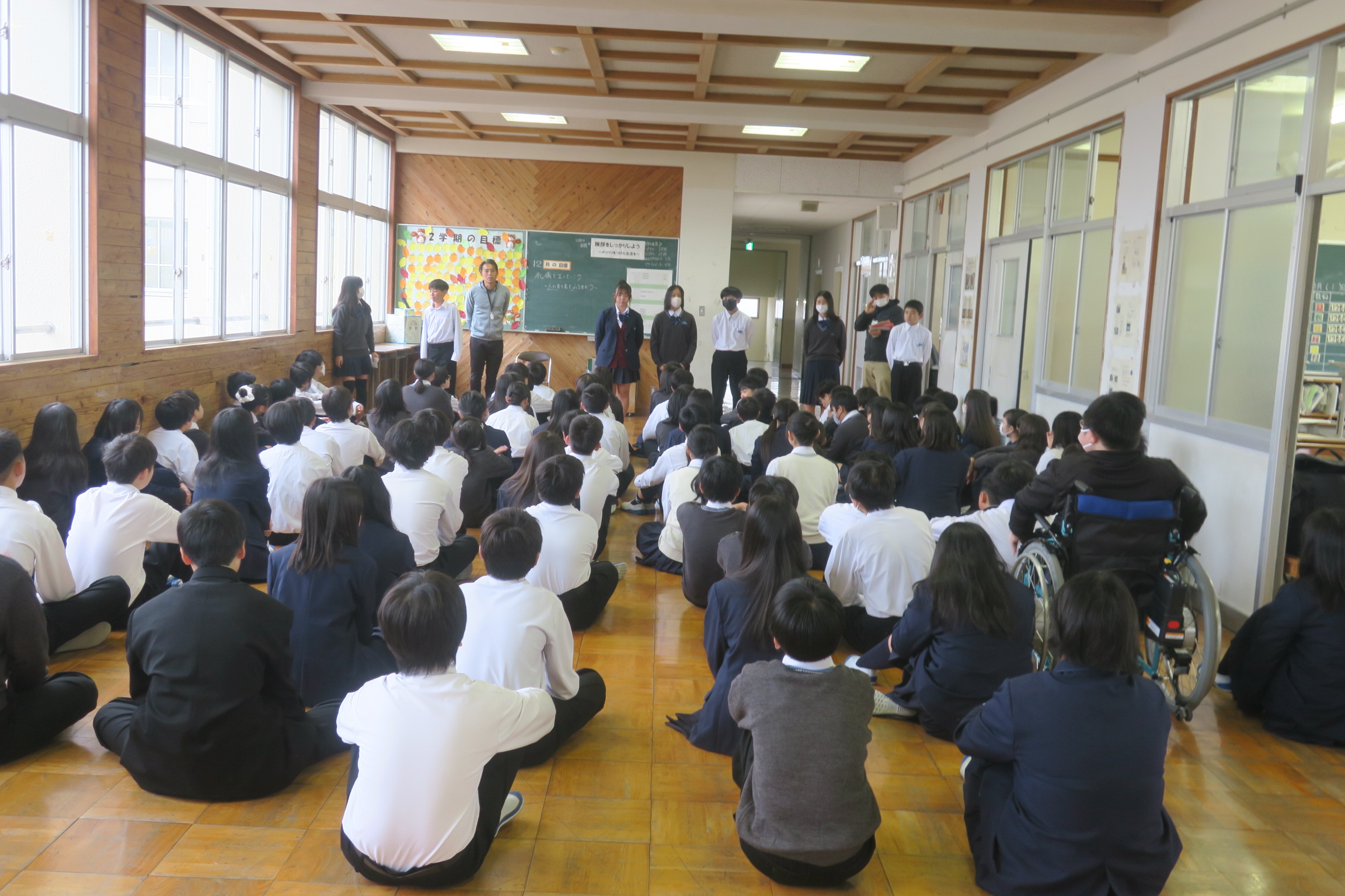 昨日は職場体験学習の体験している事業所を13カ所回ってきました。どの事業所でも懸命に働く2年生の姿がとても印象的でした。事業所の方も「とても頑張ってくれています」「積極的に動いてくれています」「とても助かっています」と話されていました。職場体験学習は今日と明日の2日間です。緊張と頑張りすぎで少しずつ疲労が蓄積されていると思いますが、笑顔を忘れずに充実した2日間を過ごしてください。1年生は昨日の6時間目に京都校外学習の説明がありました。1月23日(金)に向けて事前学習や訪問場所の決定等、グループの仲間と協力して取り組んでください。