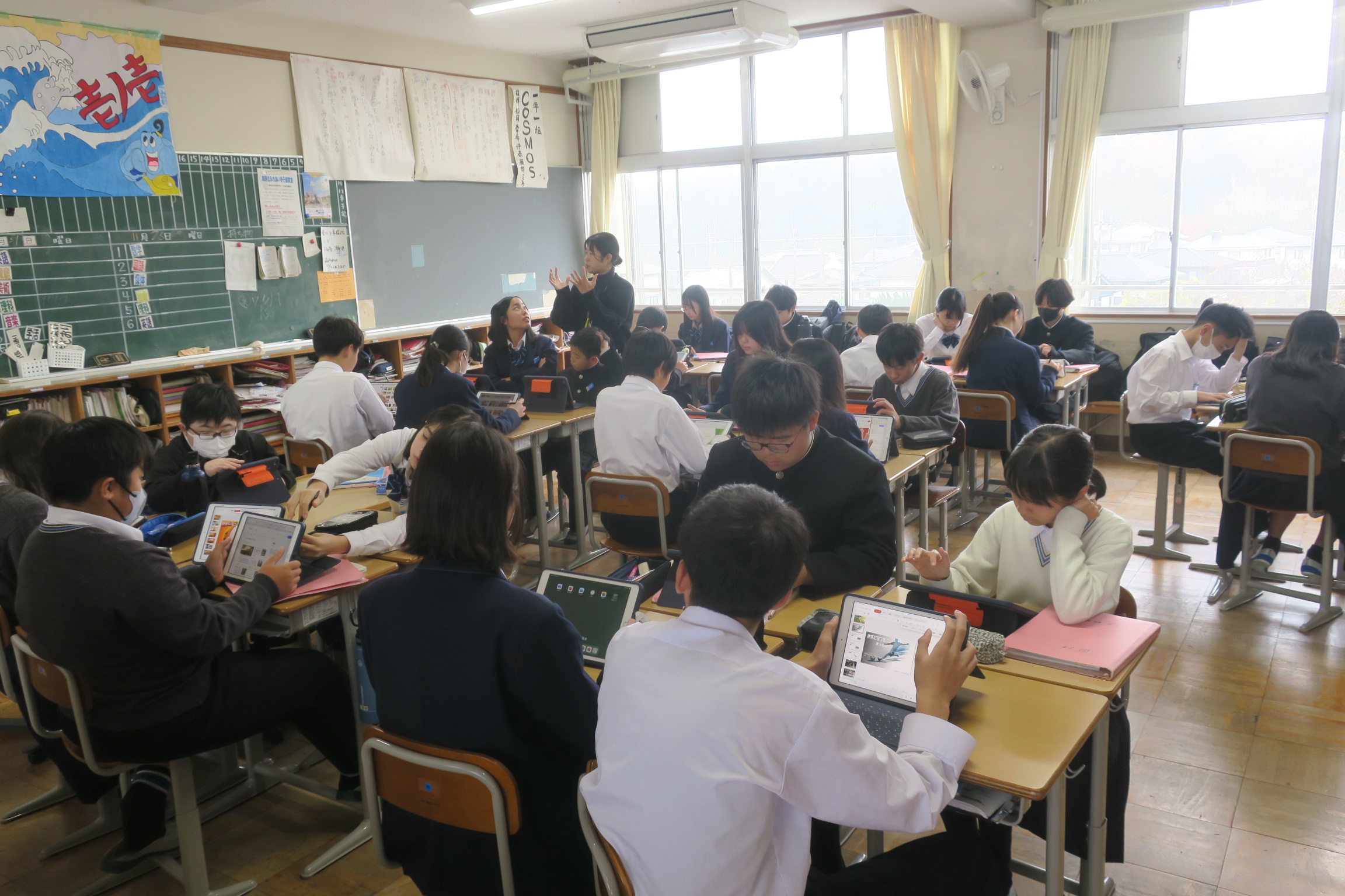今日は晴れ予報ですが朝から霧が出ていて気温がほとんど上がらず肌寒さを感じます。2年生は職場体験学習のため1、3年生が授業を受けています。1年生の国語では「自分の好きなもの」をテーマにプレゼンテーションづくりに取り組んでいます。自分の好きな物をアピールできる画像やイラストなどをシートに貼り付けて、どうして好きなのかをみんなに伝えるための文章も考えています。できあがったプレゼン資料をもとにみんなに発表する時間があるようです。みんながどのようなことが好きで、どのようにプレゼンをしてくれるのかが楽しみです。