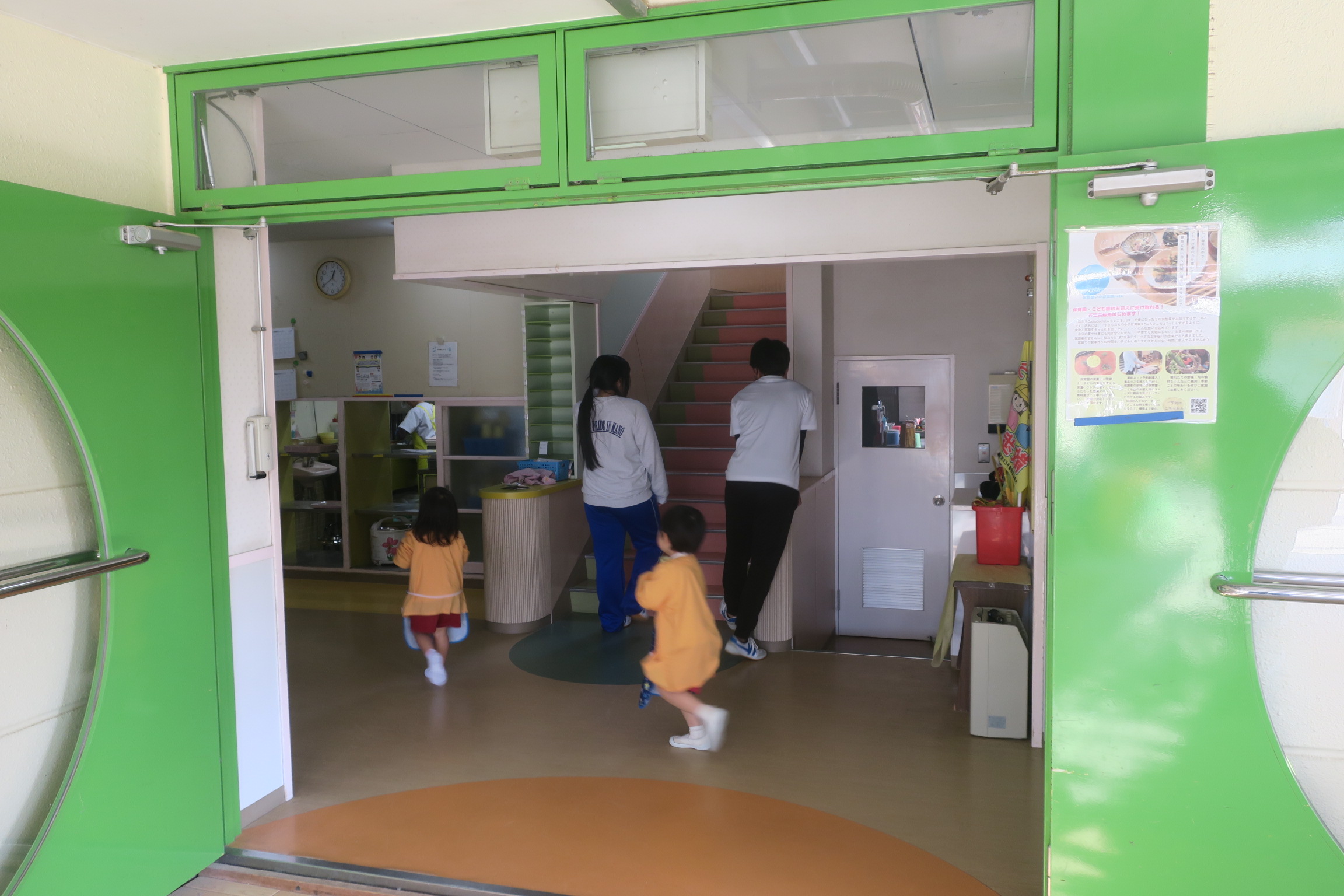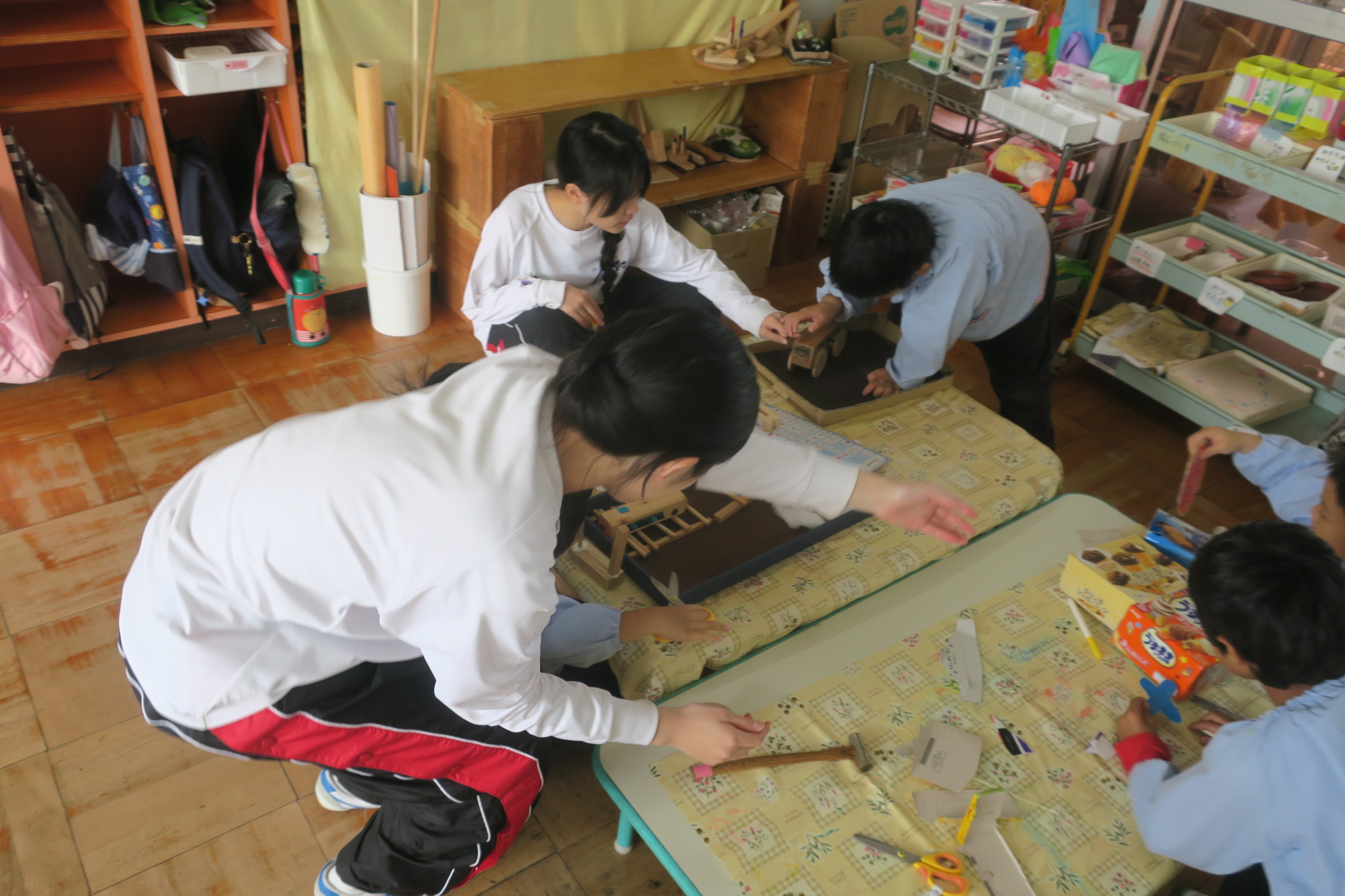 こども園では各教室に一人ずつに分かれて昼食の補助や小さいこの倉では寝かしつけを行っていました。優しく体をなでながら寝かしつける姿に心が温かくなりました。