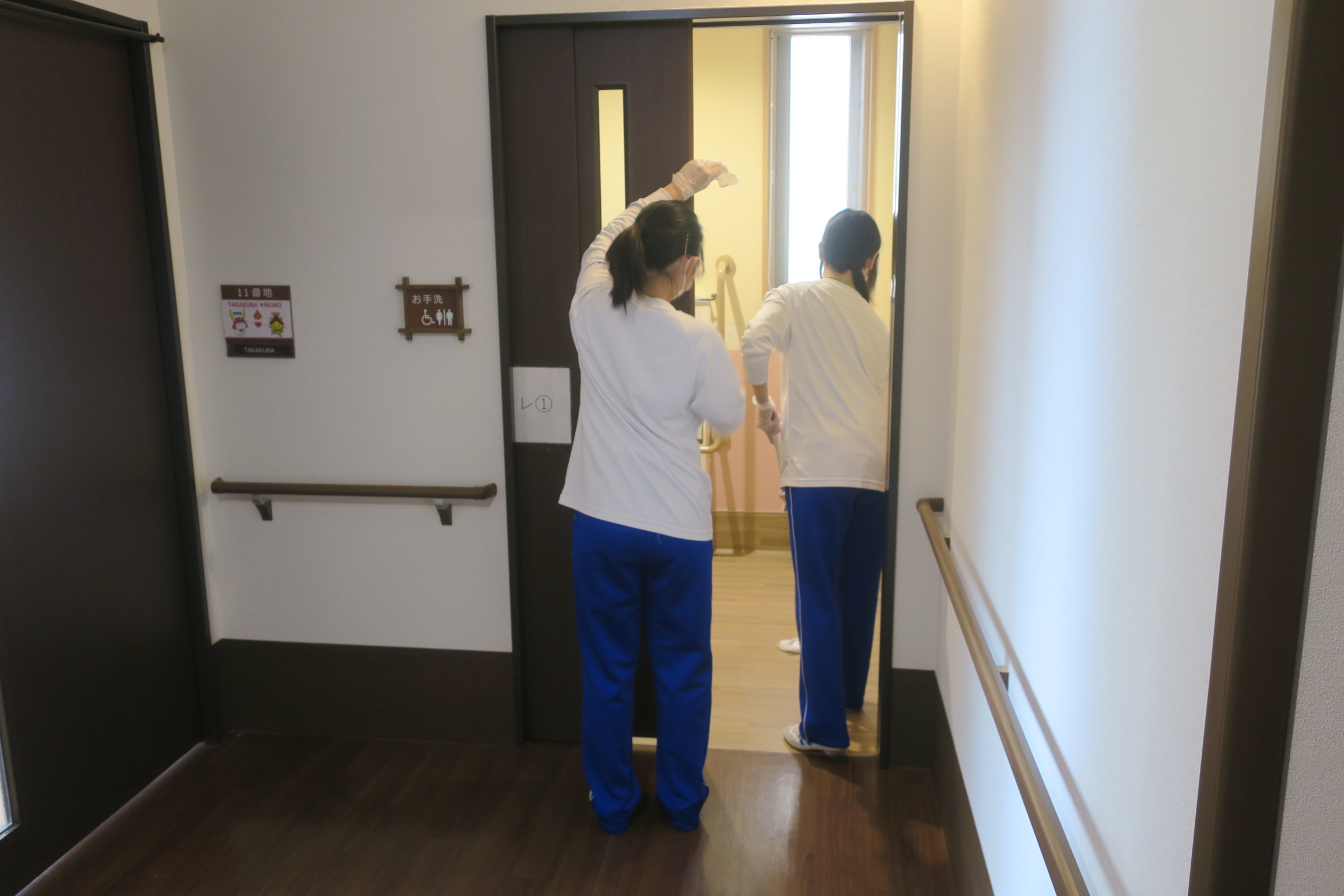 福祉施設では2人ずつに分かれて活動をしていました。施設に来所されている方の車いす用のトイレを2人組でテキパキと相似をしていました。2人は保育所の園児と神田神社周辺に散歩に出かけていました。