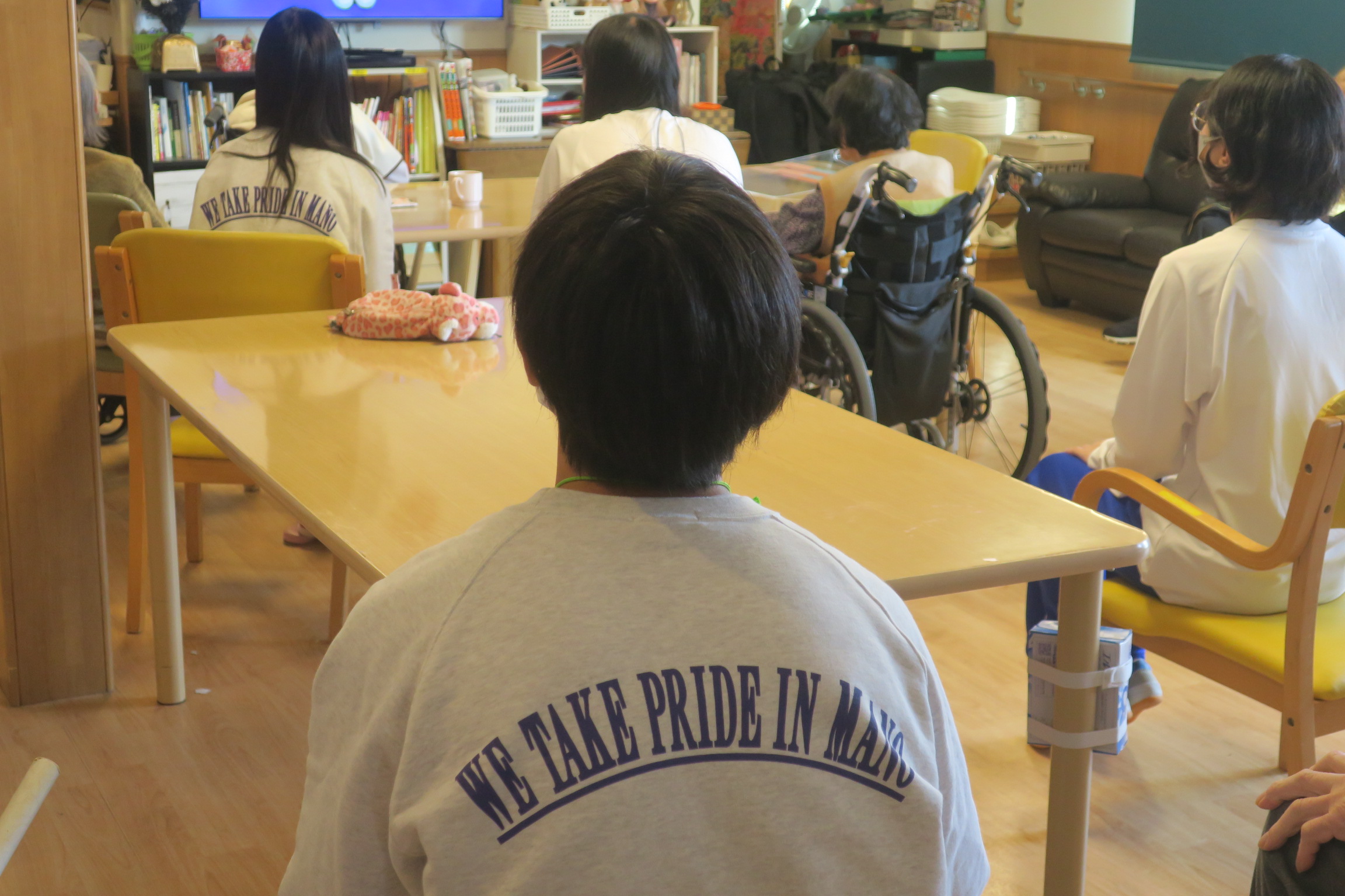 体育施設では受付、プールの監視、施設の見回り、エクササイズの体験をローテーションで行っていました。たくさん施設に来られているので少し忙しそうでした。福祉施設ではお年寄りの方と画面を見ながら手足の運動を行っていました。また、お年寄りの方と一緒に貼り絵をしていました。自分から「何かやることはありませんか」と積極的に動いてくれてありがたいと話されていました。