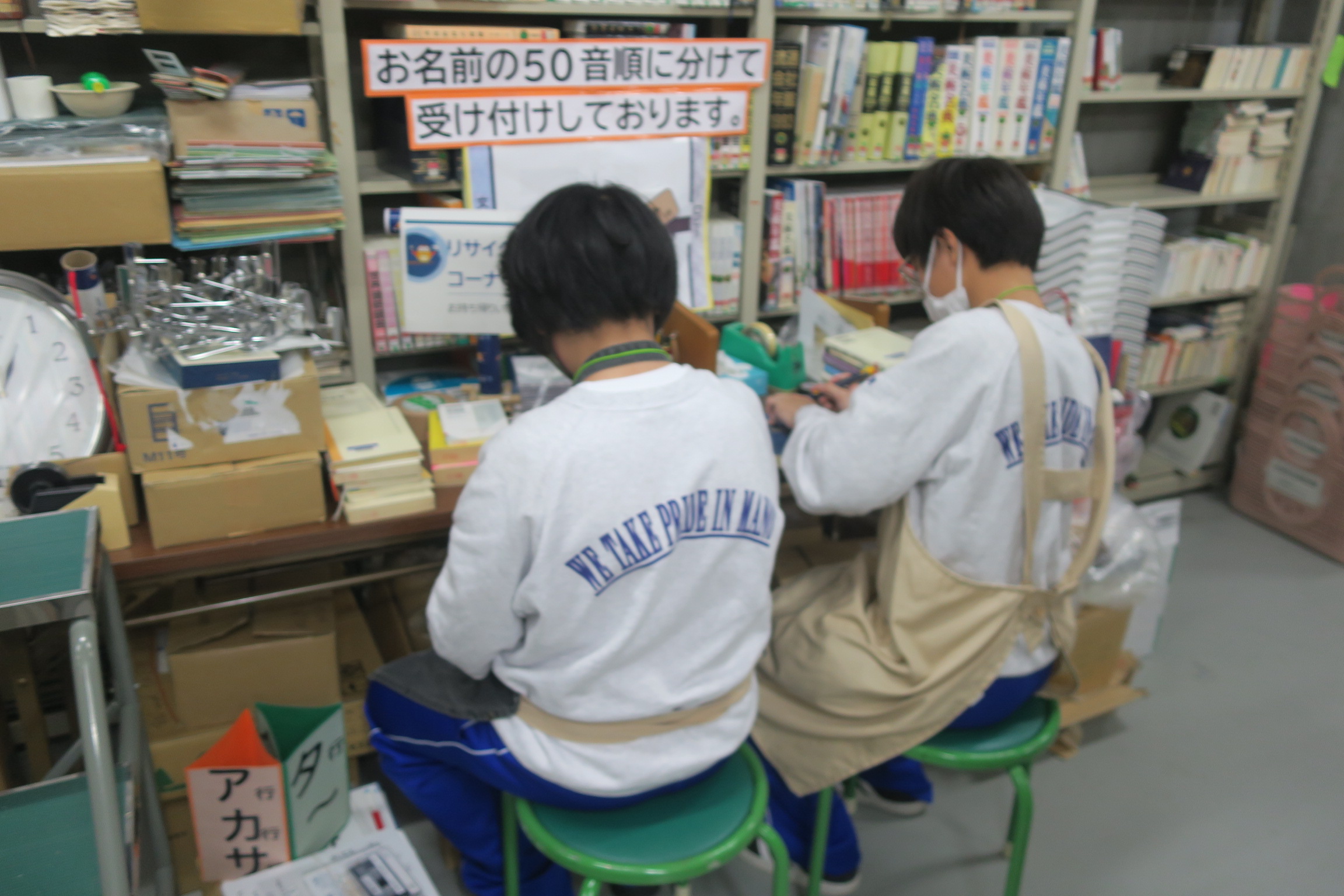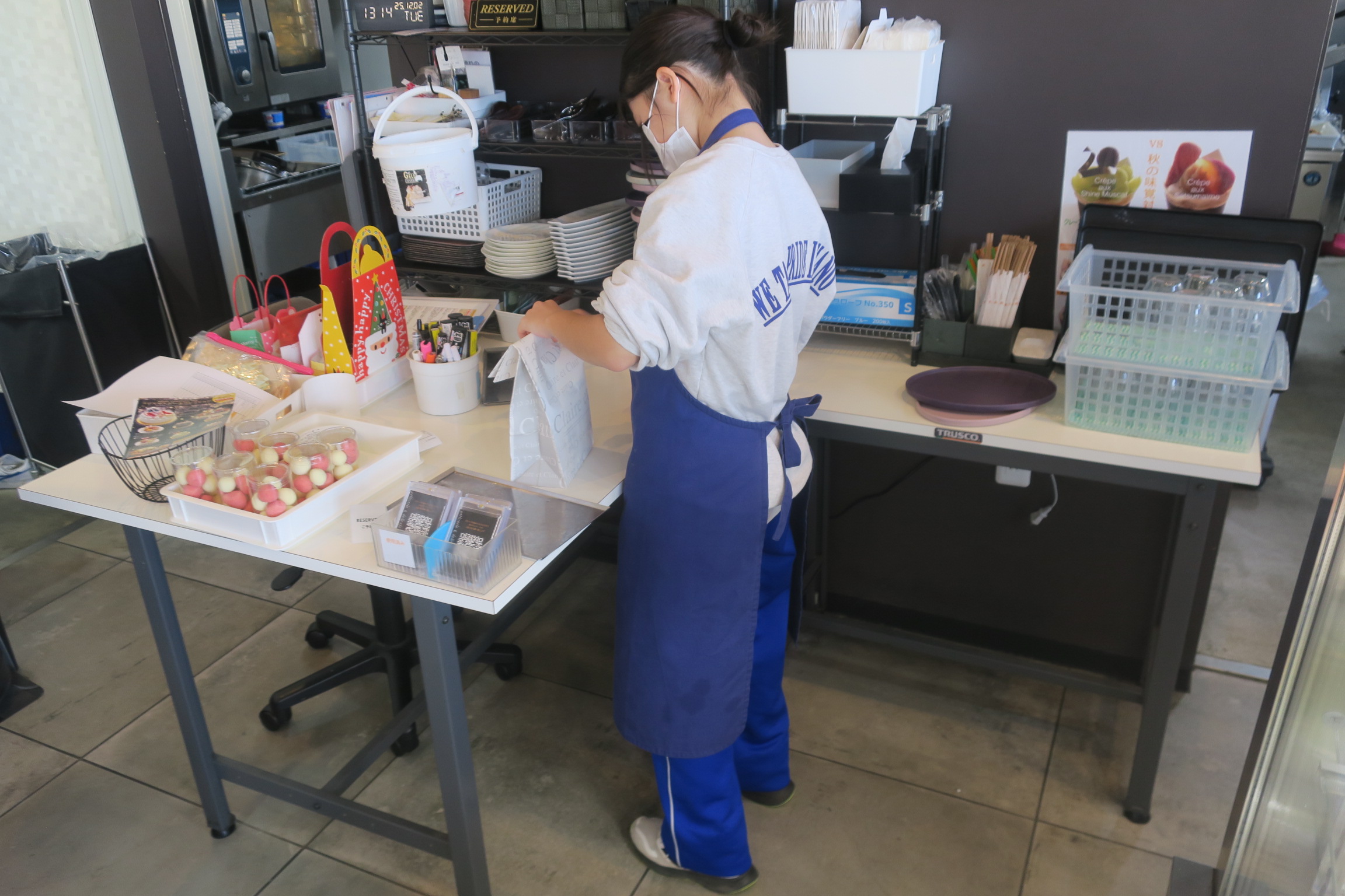 図書館では書庫で除籍する書物の貸し出しように貼ってあるバーコードをめくる作業を行っていました。除籍した書物は希望する人に差し上げるということでした。結構もらい手がいるそうです。カッターナイフを使い丁寧にバーコードをはがしていました。スイーツ店では昨日仕込んだ材料を使いクッキーづくりをしました。一つひとつ丁寧に袋に入れ店頭に30個が並べられました。売れた商品は袋に入れて精算まで行っていました。残りは5個でした。さあ、売り切れたのでしょうか。