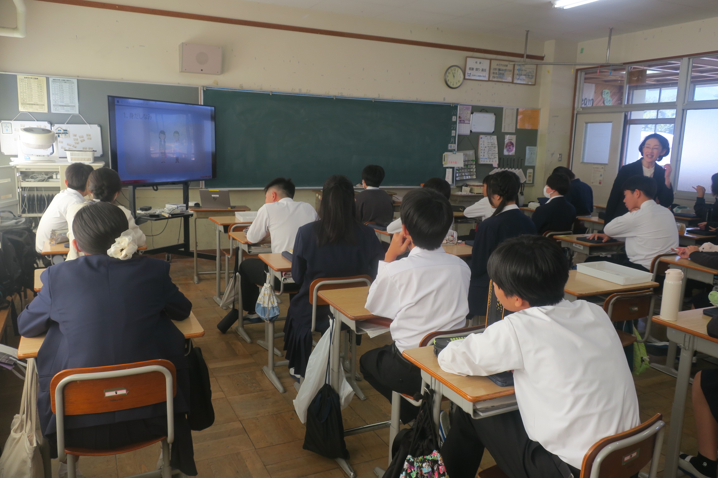 昨日は3年生の第3回進路説明会を行いました。進路決定までの流れ、進路決定に必要な手続き、滋賀県立高校の新入試制度・web出願について説明をおこないました。2年生は職場体験学習に向けてマナー講座をおこないました。職場体験学習で大切なこと、言葉遣い、事前訪問のアポイントメントの取り方などを学びました。昨日の午後から北寄りの冷たい風が吹いてきました。昨日よりも昼間の気温は5℃近く低いようです。夕方から気温が下がり始め明日、明後日の朝は10度以下になる予報が出ています。服装で調節して体調管理に努めましょう。