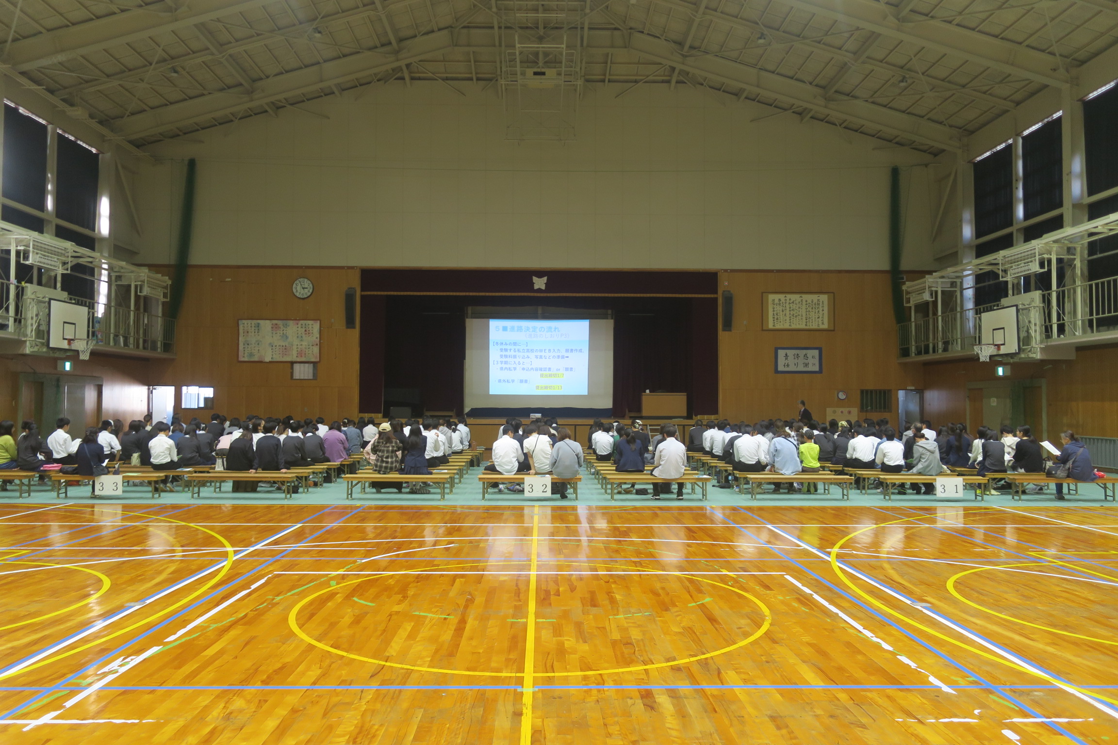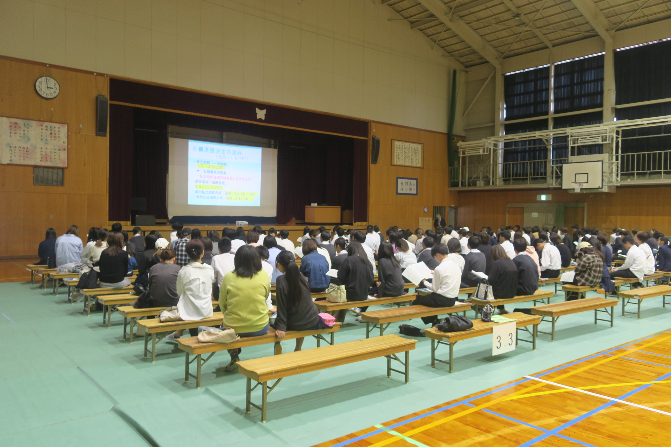 今日の6時間目に第3回進路説明会を行いました。今回は生徒と保護者が一緒に体育館に入り説明を聴きました。今日の進路説明会は進路決定までの流れ、受検(験)の方法や受検(験)の手続きについて説明がありました。今年度は県立高校の入試制度が新しくなり、web出願も始まります。進路決定までのイメージをつかんでいただけたでしょうか。