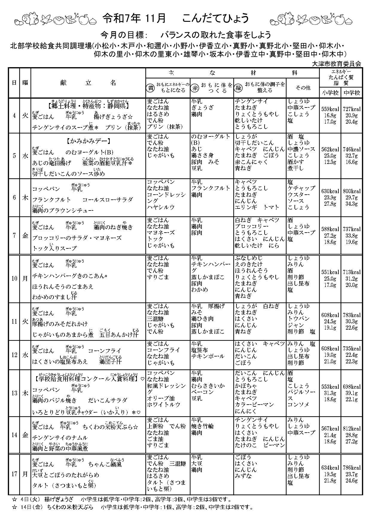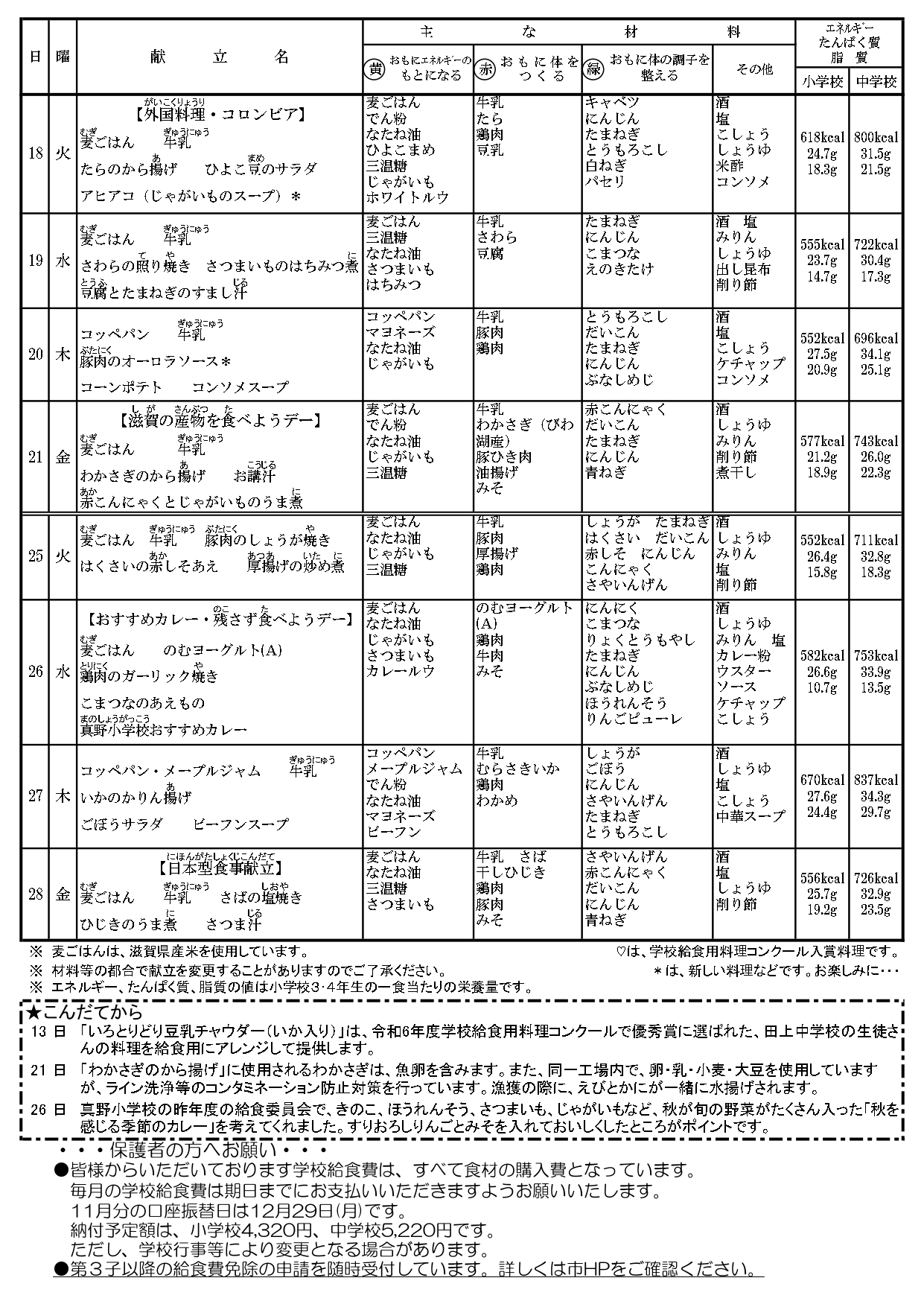 今日の給食は「滋賀の産物を食べようデー」でした。メニューは麦ごはん、牛乳、赤こんにゃくのおかか煮、わかさきのから揚げ、かしわのじゅじゅんでした。かしわのじゅんじゅんが立ち番人気でした。どのクラスもおかずの食缶はほぼからっぽでした。滋賀県の産物はなかなか家でも食べる機会はありません。みんなおいしそうに食べていました。「ごちそうさまでした」