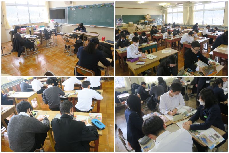 明日に滋賀県立高校入試を控えている3年生は今日が中学校で受ける教科の最後の授業になりました。3年間、真野中学校で過ごしてきた思いを大切にして最後の授業を1時間、1時間大切にしてほしいと思います。今日の1時間目の授業の様子です。