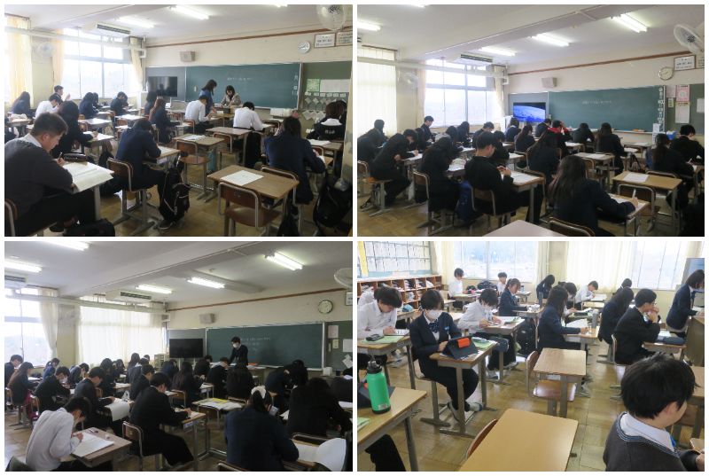 3年1組は英語、3年2組は社会、3年3組は数学の滋賀県立高校入試に向けた模擬テストに取り組んでいました。