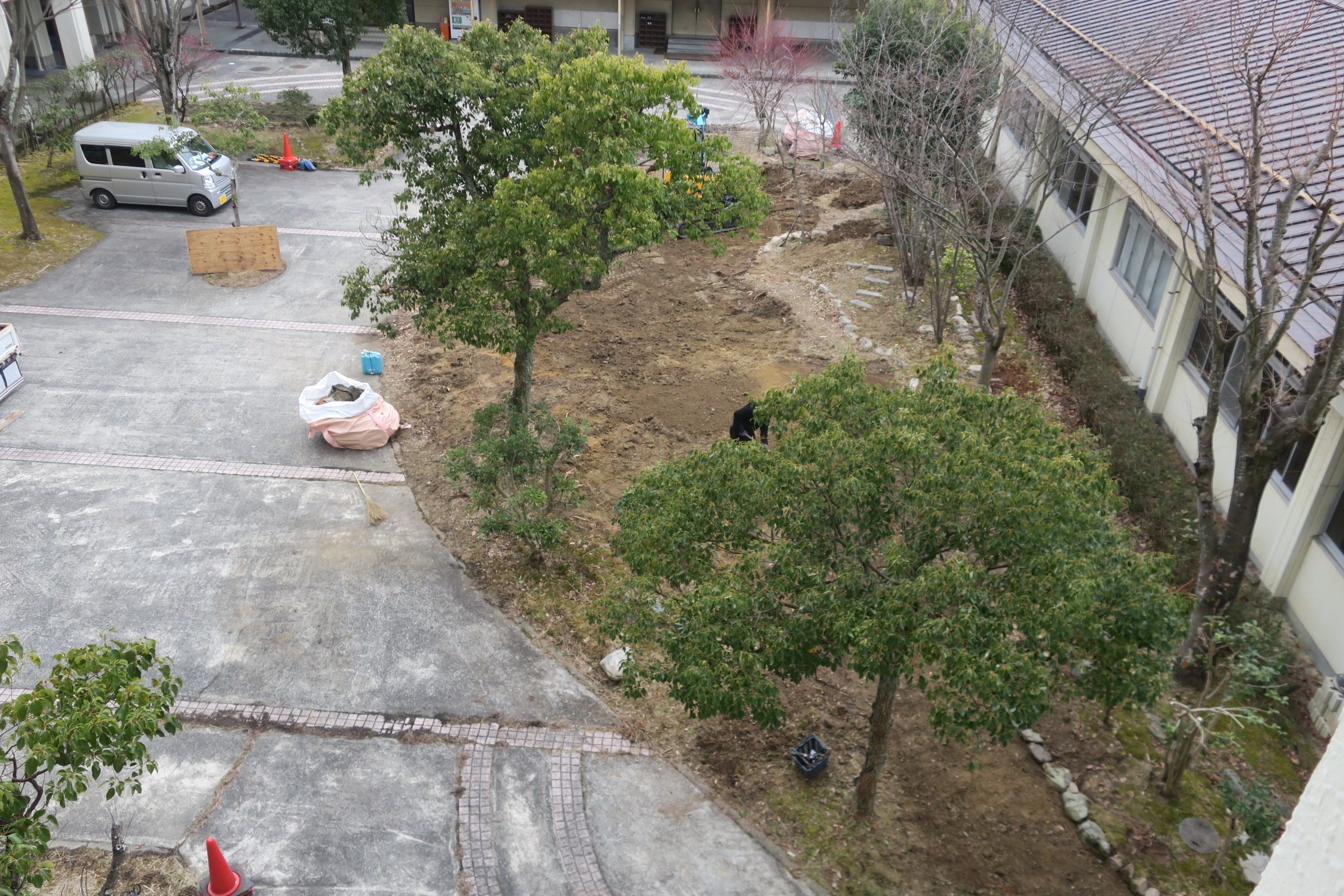 先週の木曜日、金曜日におこなわれた中庭プロジェクト第2弾の工事が無事に終了しました。工事をしていただいた業者(保護者)のみなさま、ありがとうございました。協力していただいたPTAのみなさま、ありがとうございました。故障していたビオトープの装置も撤去され、ビオトープも埋められました。整備された中庭が顔を出しました。地面が乾くのにはもう少し時間がかかりそうです。