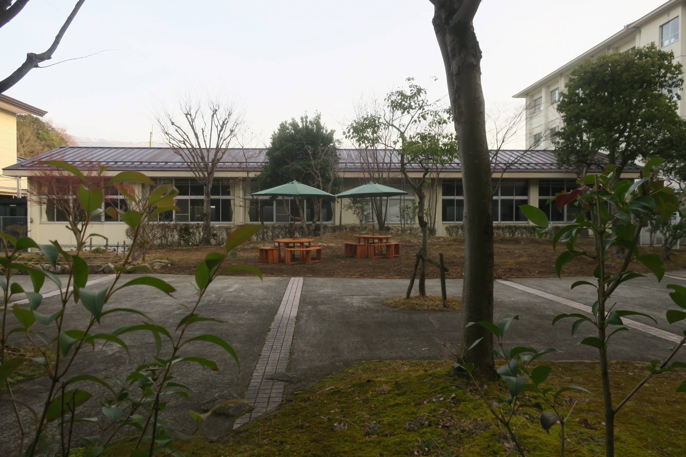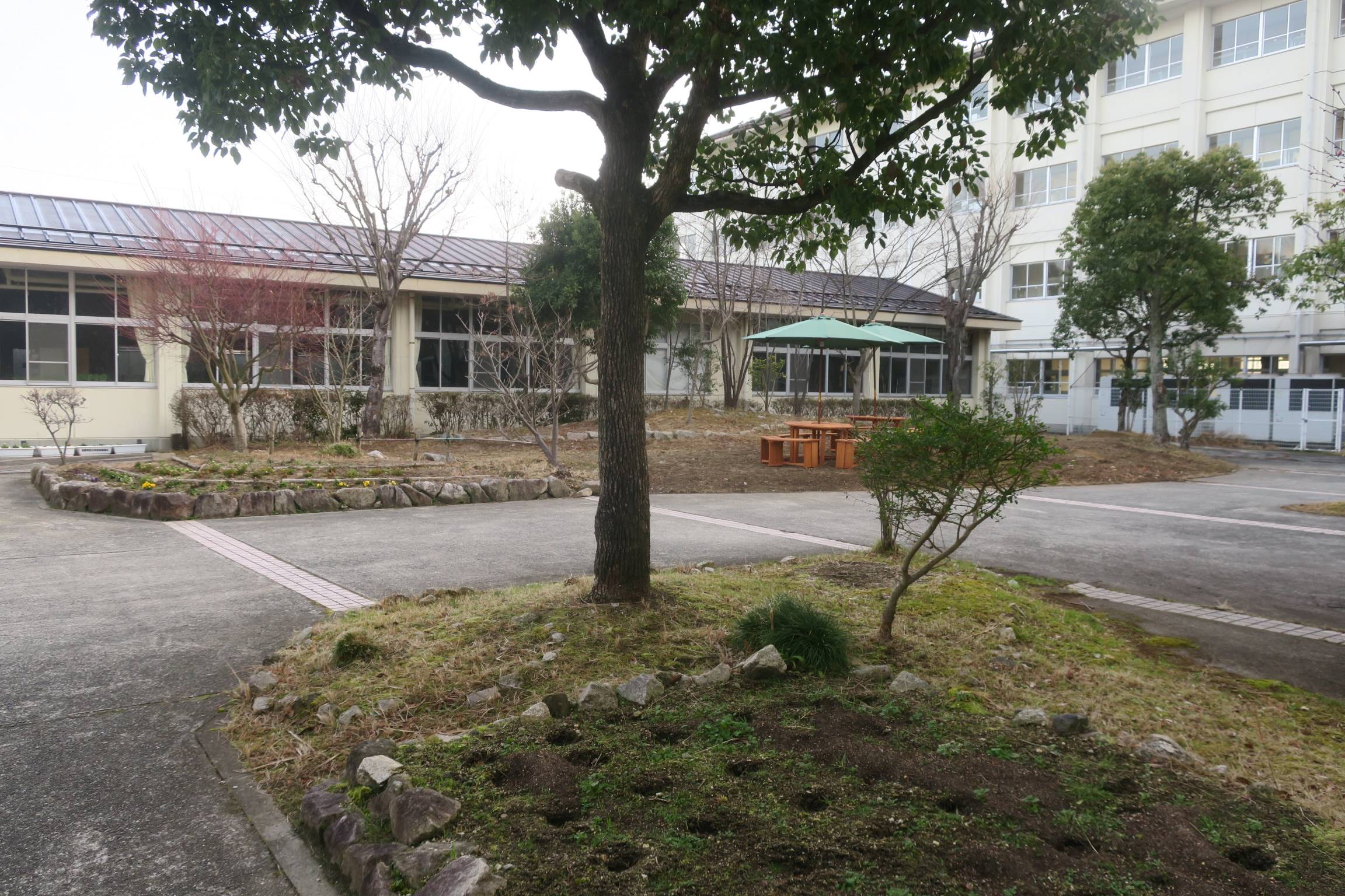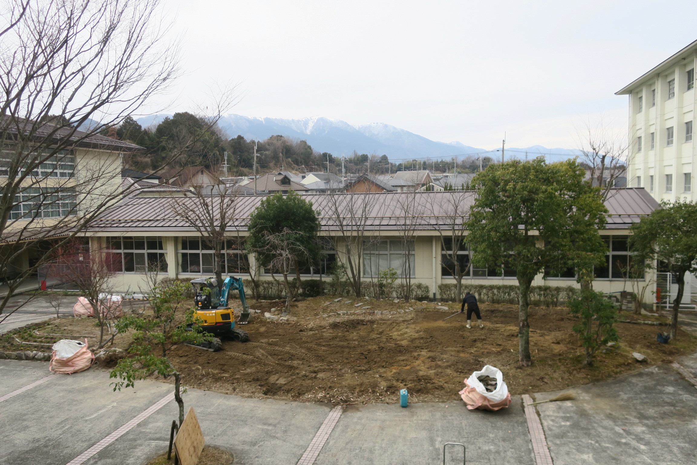 これからパラソルつきの円形ベンチを4つ置き、花を植えたプランターを置いて、真野中生の憩いの場となる中庭づくりをおこなう予定です。卒業式までにある程度の形を作りたいと考えています。楽しみにしておいてください。