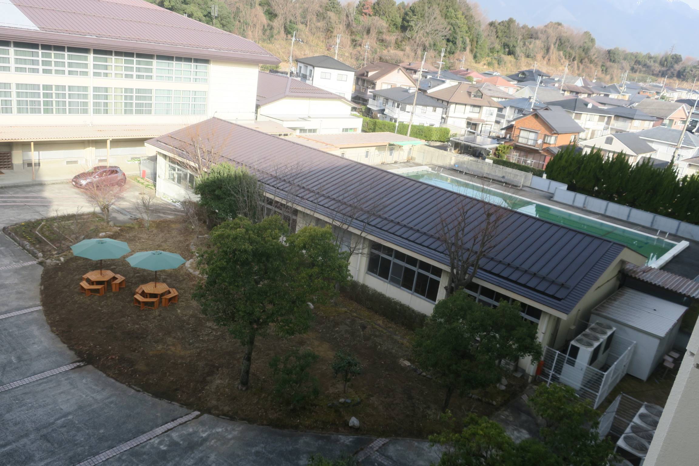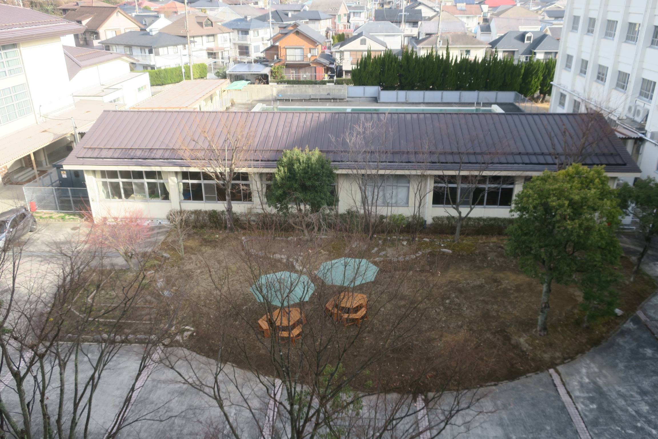 中庭にパラソル付きのベンチを2つ設置しました。新たに2つパラソル次のベンチを設置する予定です。そして、プランターを置いて花やかな中庭にしていく予定です。少しずつ生まれ変わっていく予定です。楽しみにしておいてください。
