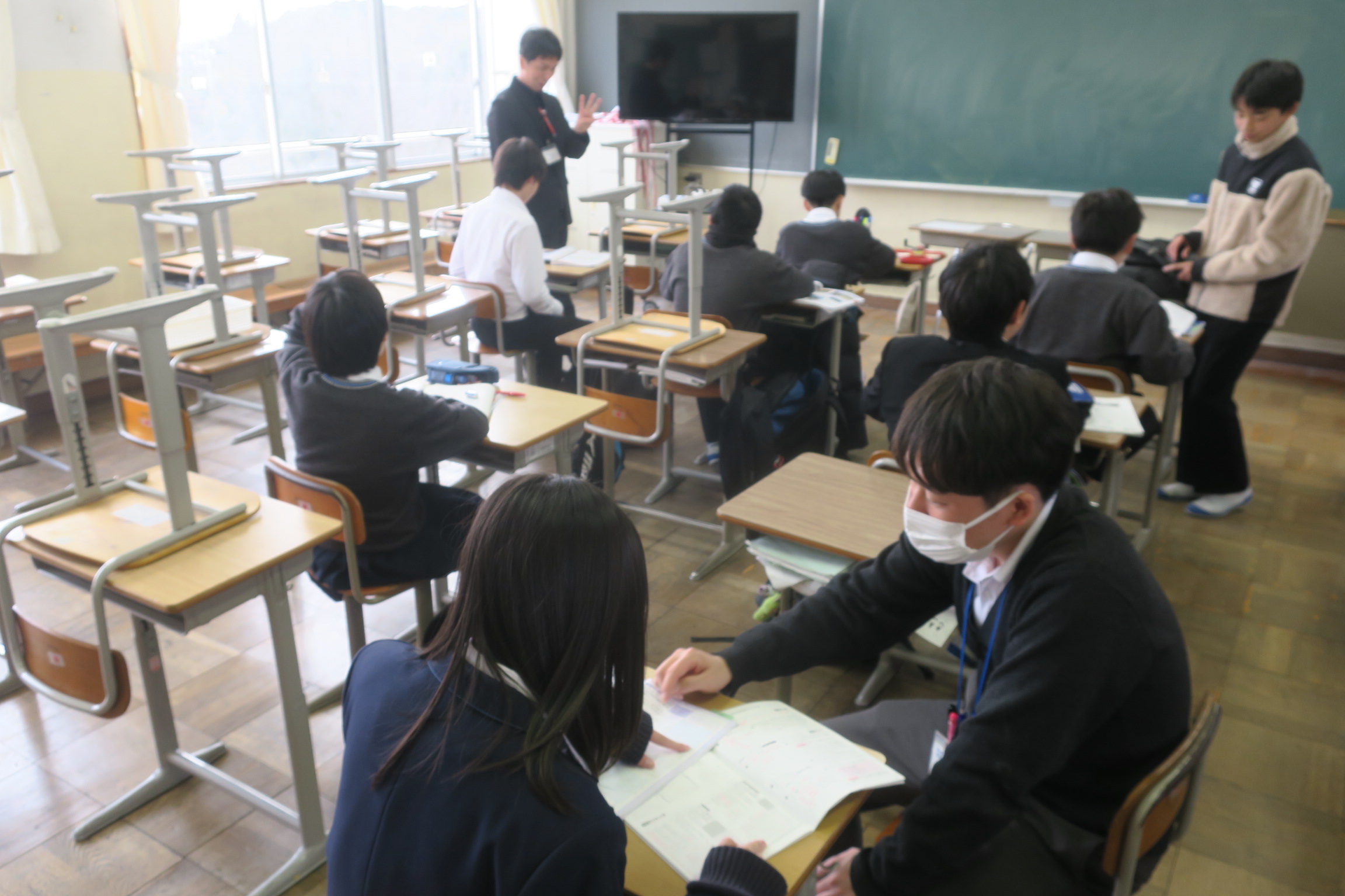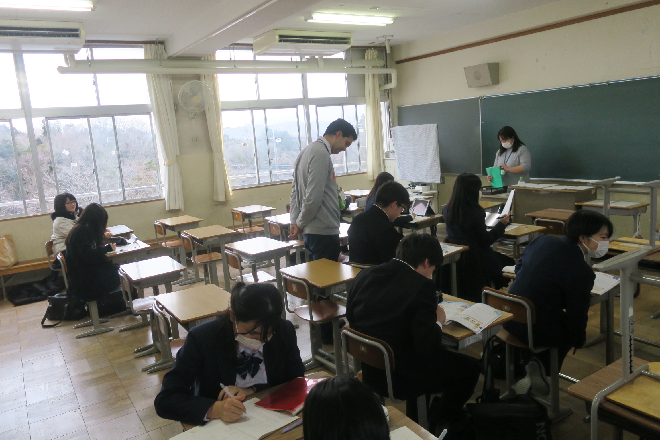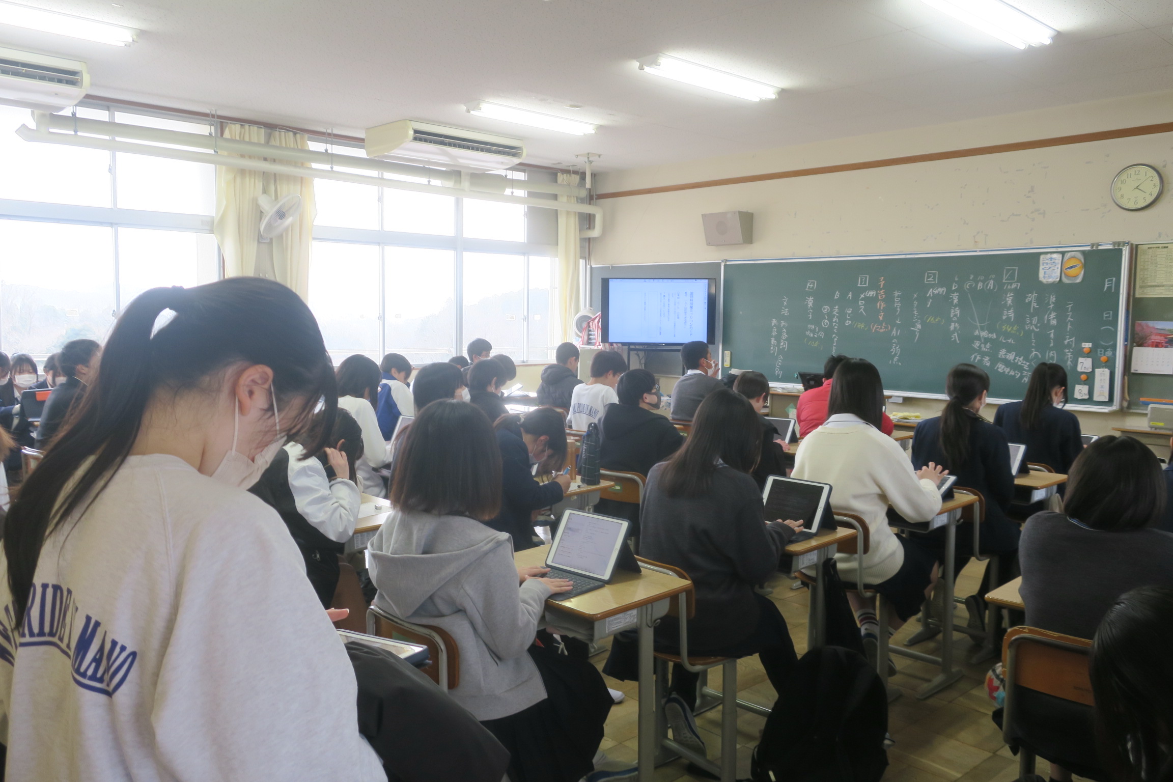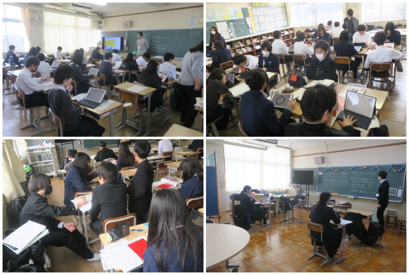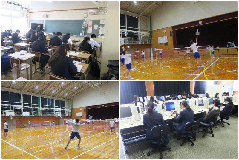 3年1組は体育の授業でした。体育館でバドミントンをプレイしていました。交代しながら最後のバドミントンを笑顔でシャトルを打ち合っていました。3年2組は国語の授業でした。明日の入試に向けてまとめの問題に取り組んでいました。3年3組は技術の授業でした。3年間使用してきたタブレット端末を次に使う人のために自分のデータを消す等、整理をしていました。