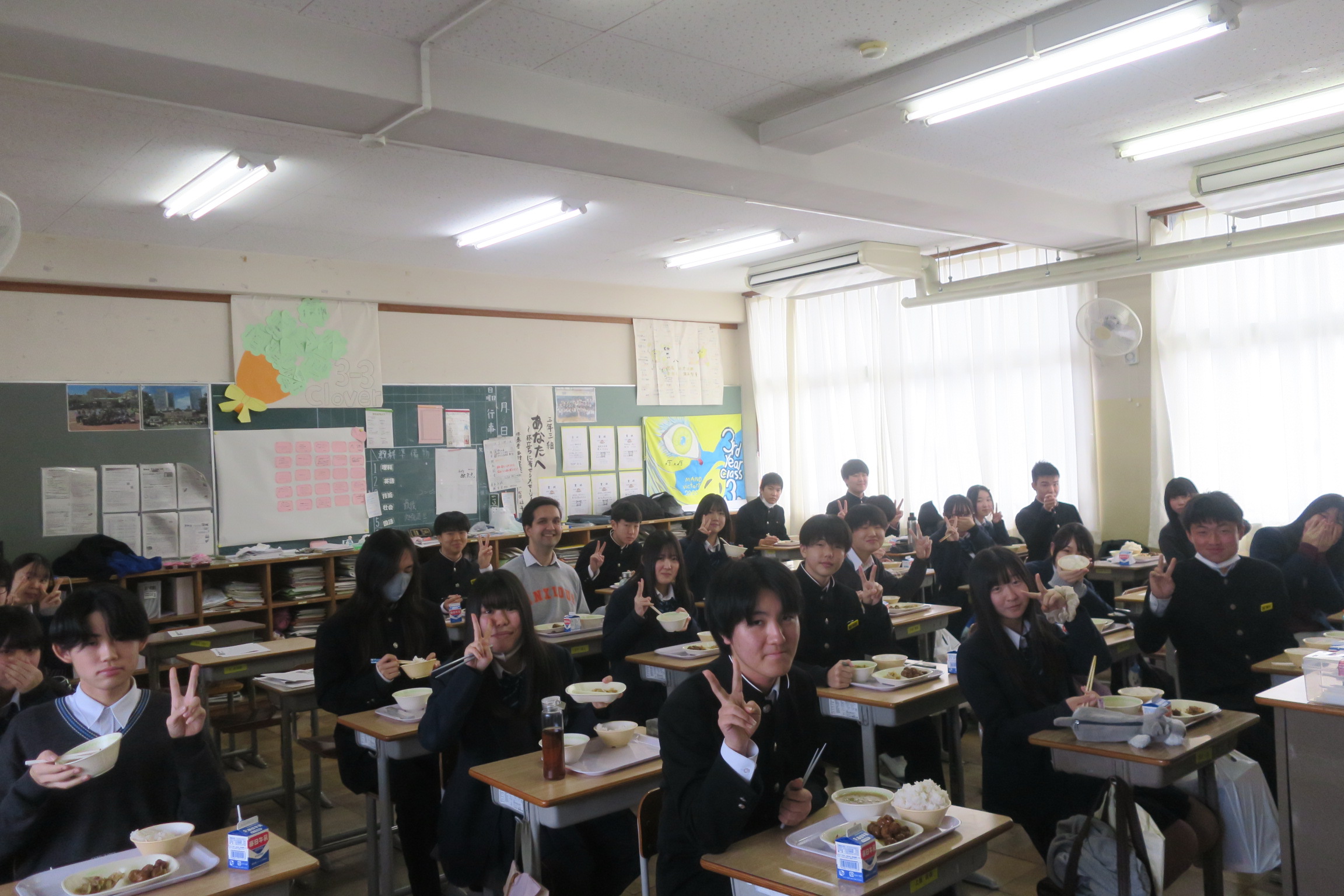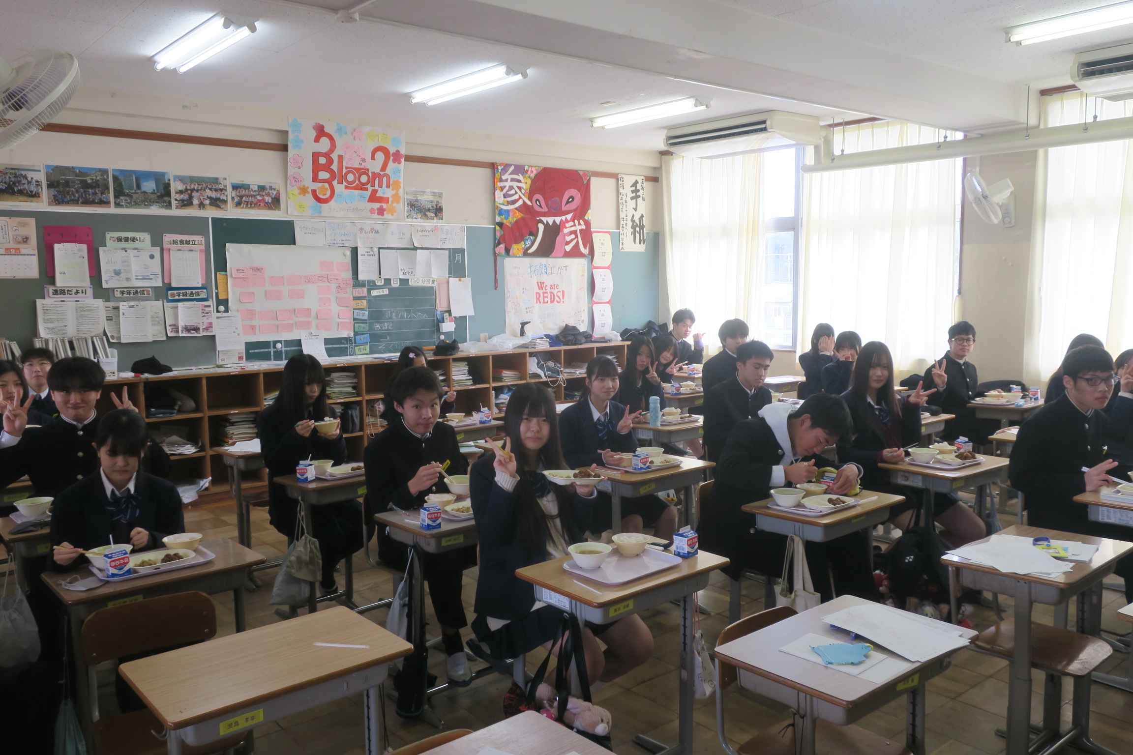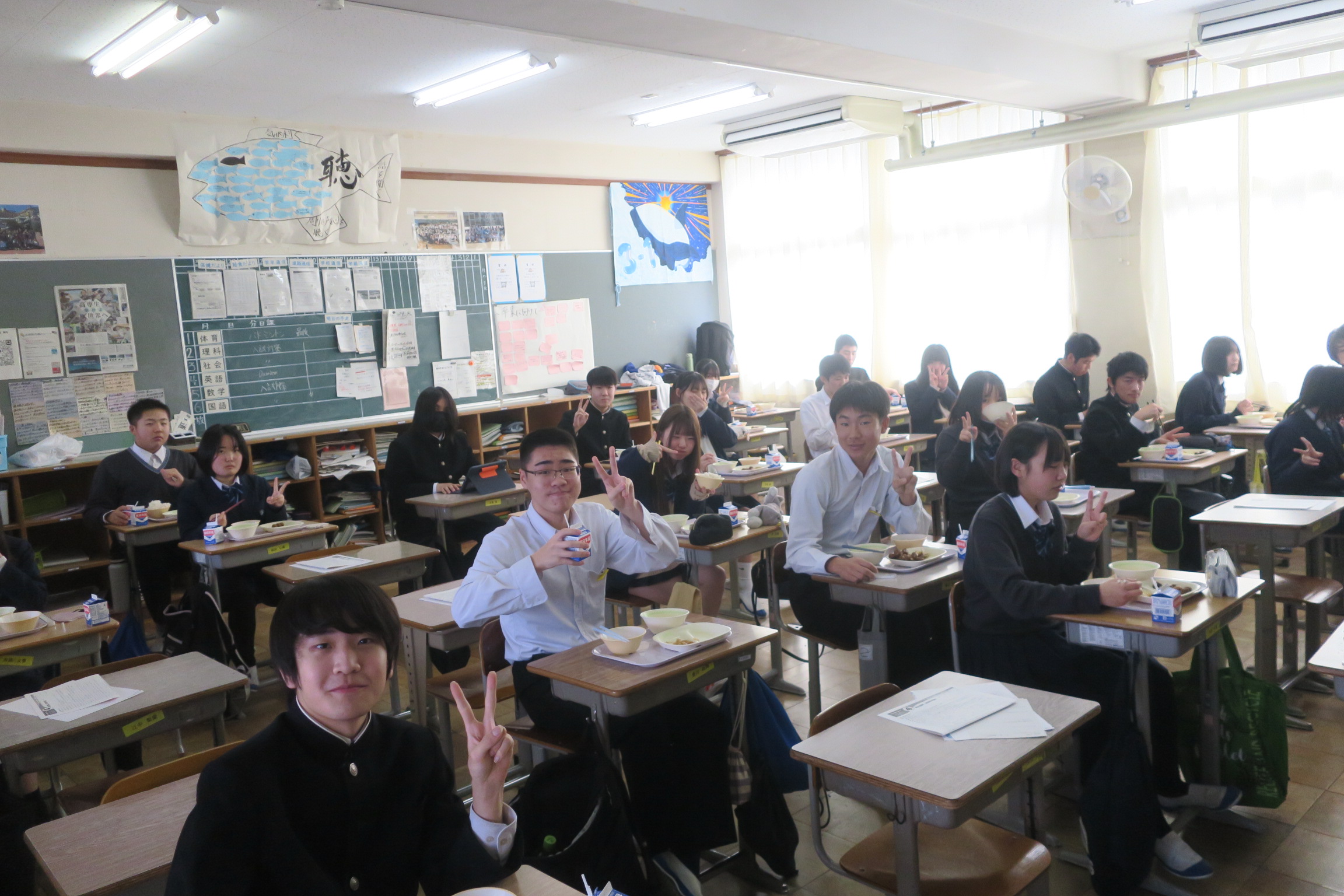 今日は3年生が中学校での給食が最後の日になりました。小学校1年生から食べ続けてきた給食が今日で終わりになりました。最後のメニューは麦ごはん、牛乳、鶏団子の甘酢、れんこんのおかかあえ、のっぺい汁でした。最後もおかわりをいっぱいする人がいました。3年生のみなさん、最後の給食はおいしく食べることができましたか。「ごちそうさまでした」中学校生活が一つずつ終わっていきます。