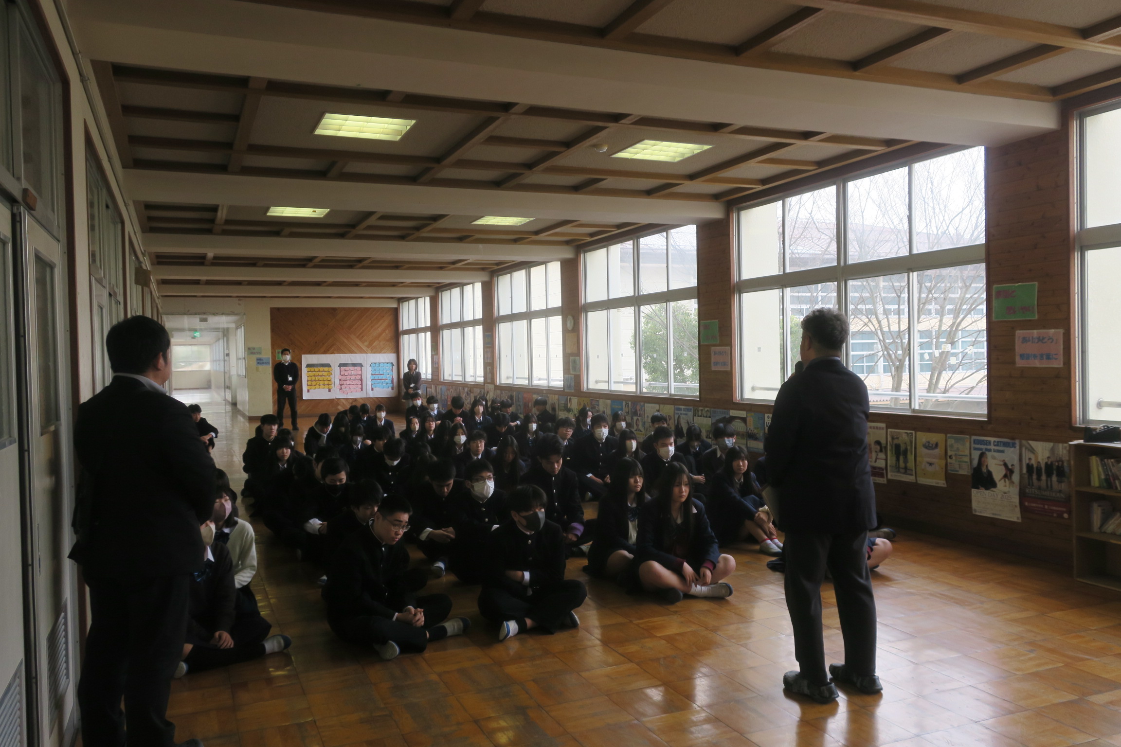 今日の6時間目終了後に明日の滋賀県立高校入試に向けて事前指導をおこないました。緊張した引き締まった表情でフロアーに整列をしました。まず、校長先生から「いよいよ滋賀県立高校入試本番を迎えます。ここまで努力してきた自分を信じてください。不安は本気で頑張ってきた証です。家族や仲間、先生方がいつも支えてくれています。今日はしっかり食べてしっかり休み、万全の体調で臨みましょう。みなさんなら大丈夫です」と話がありました。