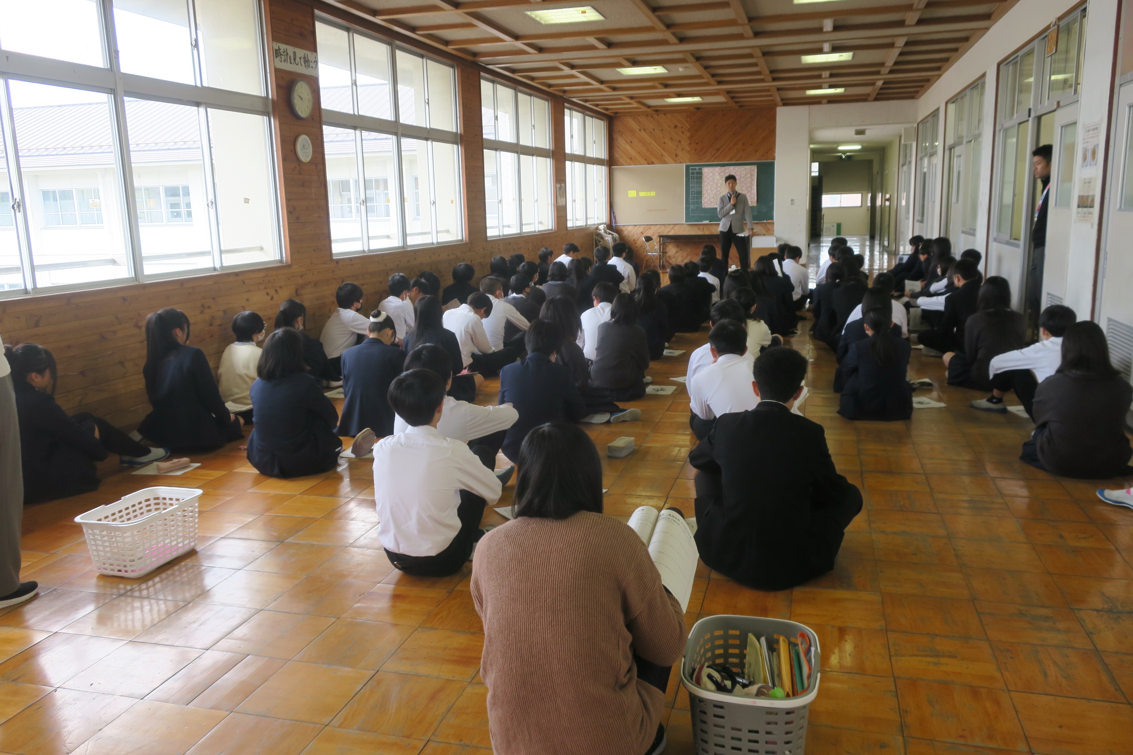 今日は朝から霧がかかっていましたが霧も少しずつはれて青空が広がり温かな太陽の日差しが降り注いでいます。今日は2年生の職場体験学習初日です。良い天気になってよかったです。今日の1時間目の授業の様子です。1学年いないだけで授業中の学校は静まりかえっています。