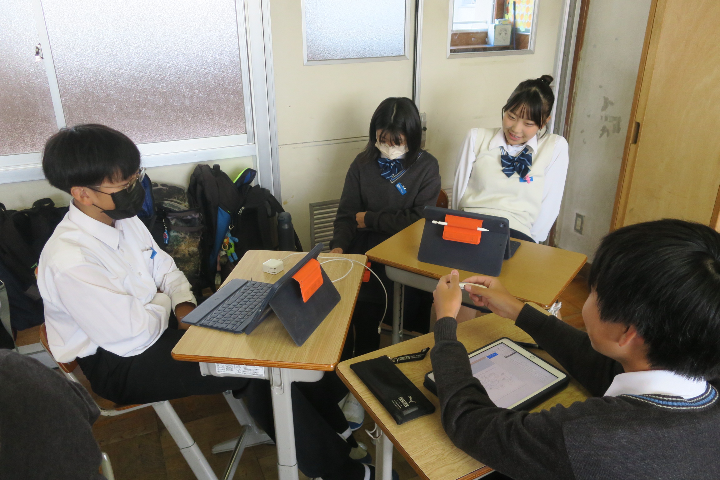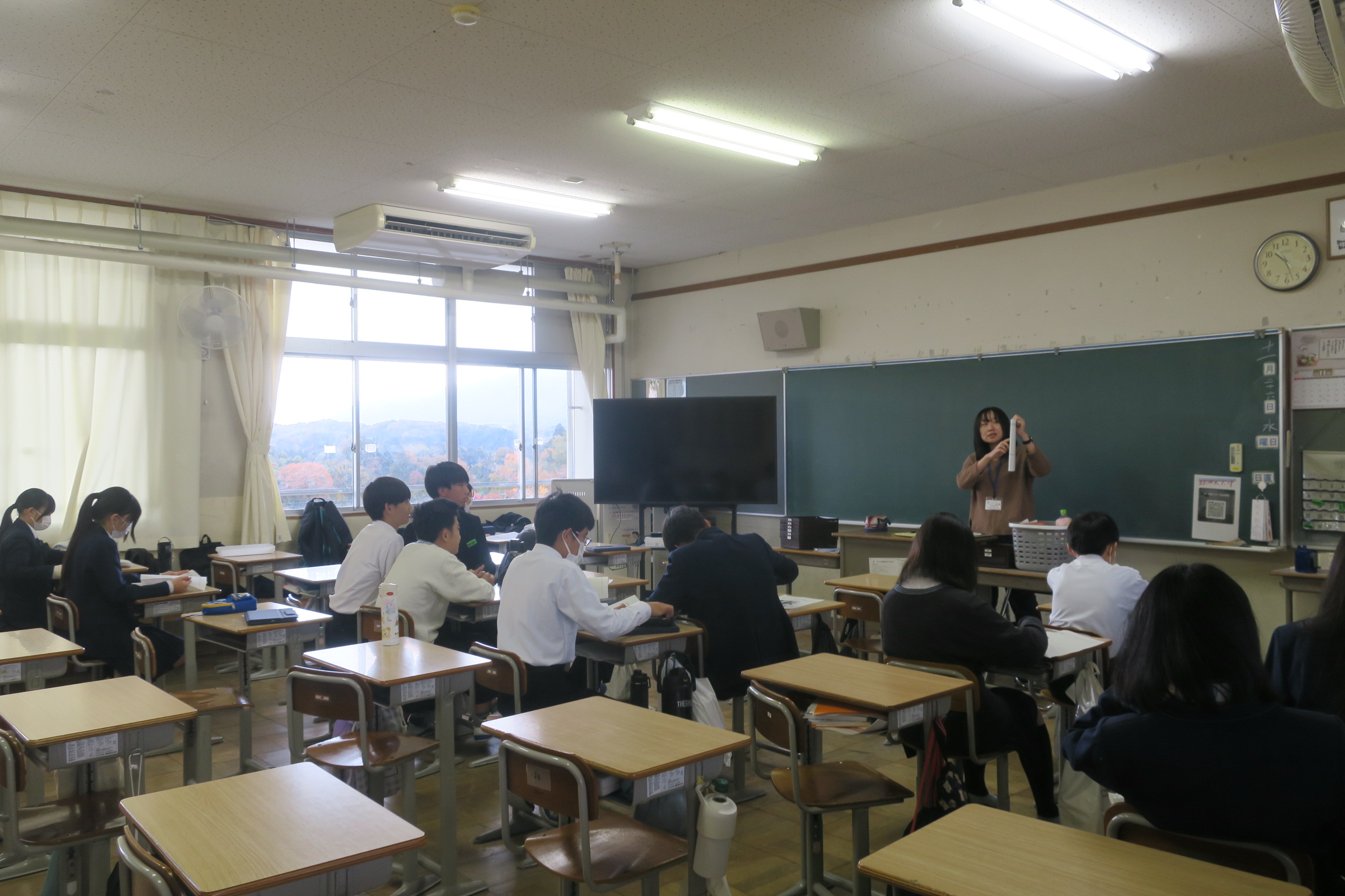 今日は朝から青空が広がる秋晴れになりました。太陽の日差しに温もりを感じます。インフルエンザ等による体調不良による欠席者は昨日から増えていません。引き続き手洗い、うがい、十分な睡眠、栄養等、感染症対策をお願いします。今日の1時間目の様子です。期末テストの返却がいくつかの授業でありました。
