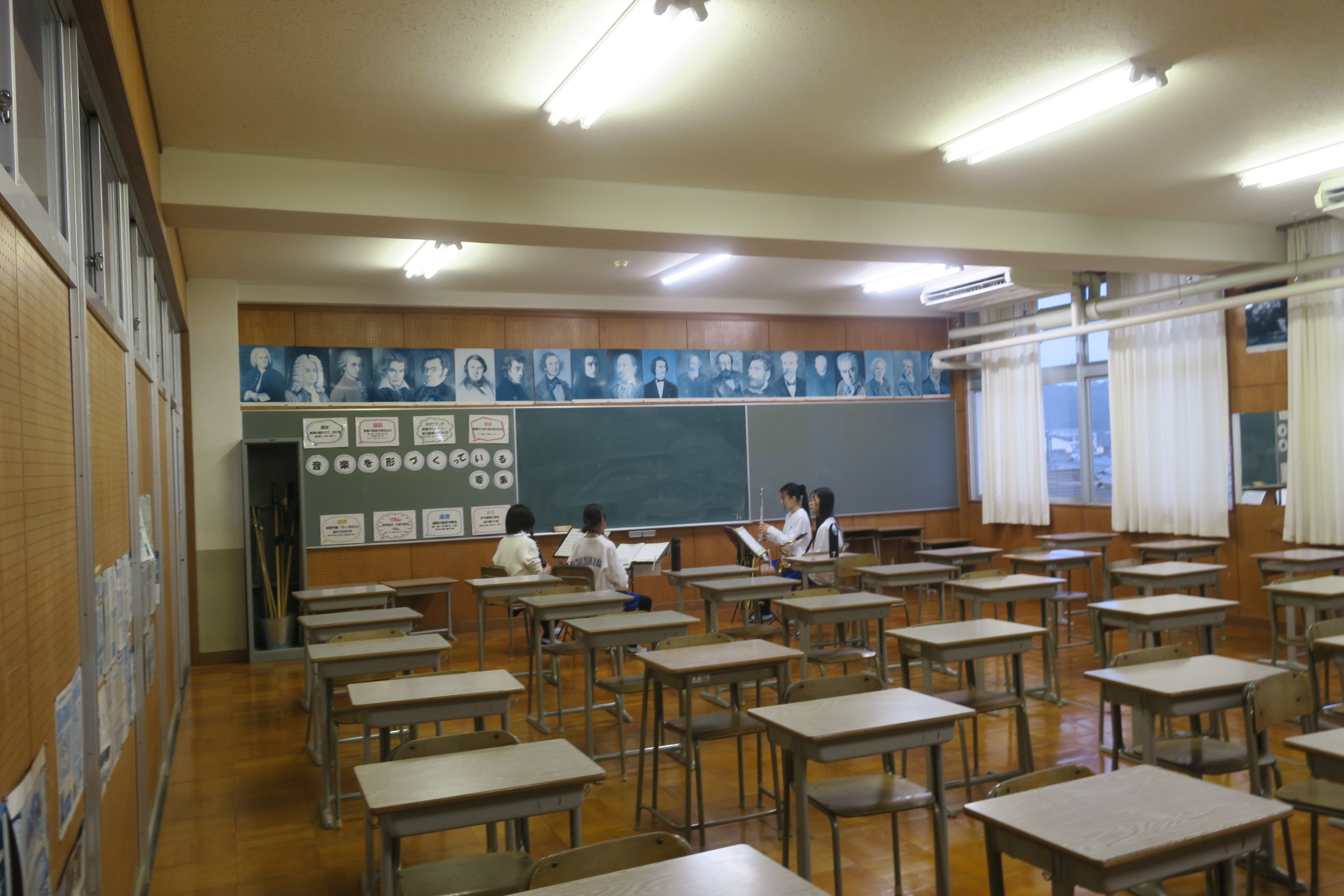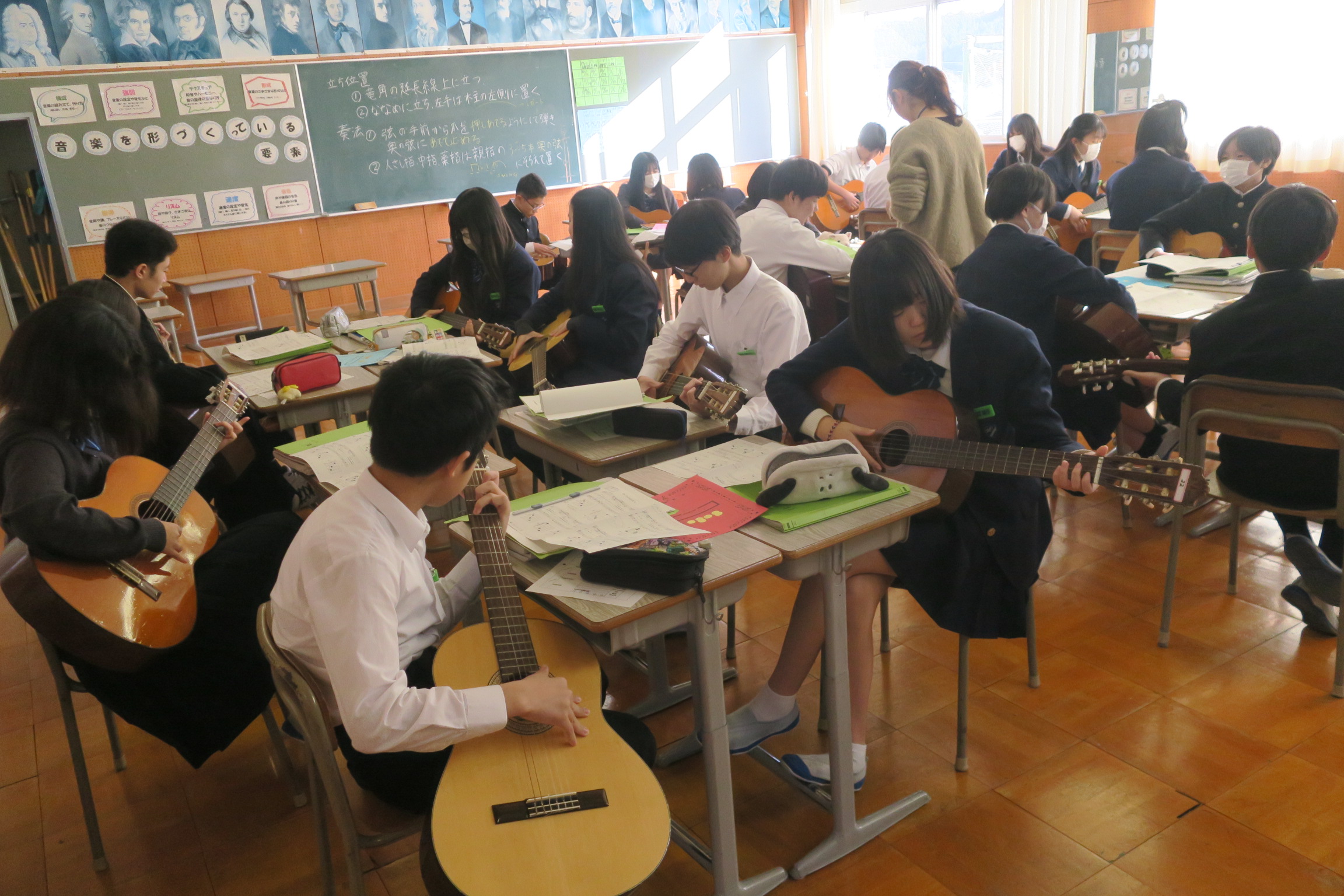2年1組は音楽の授業でした。ギターの練習をしていました。コードの練習、ドレミファソラシドを弾く練習をしていました。ギターを弾く姿がとても格好よかったです。