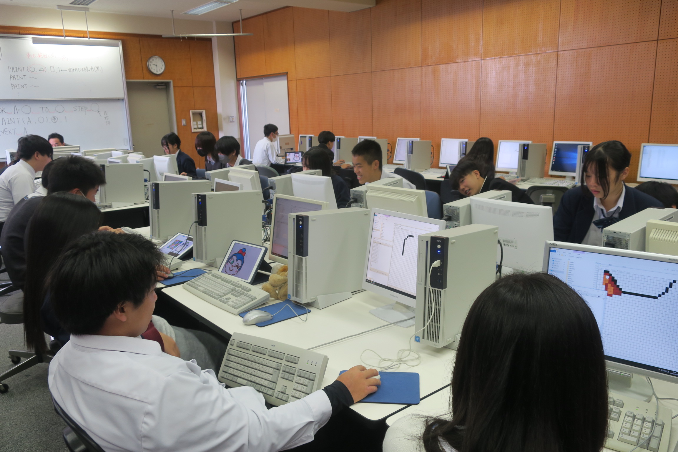 3年2組は数学の授業でした。相似の応用問題のプリントに取り組んでいました。グループで教えないながら問題を解いていました。3年3組は技術の授業でした。コンピューターでプログラムを組んで絵を描いていました。下絵を見ながらプログラムを一ずつ組んで細かいところまで丁寧に作業をしていました。