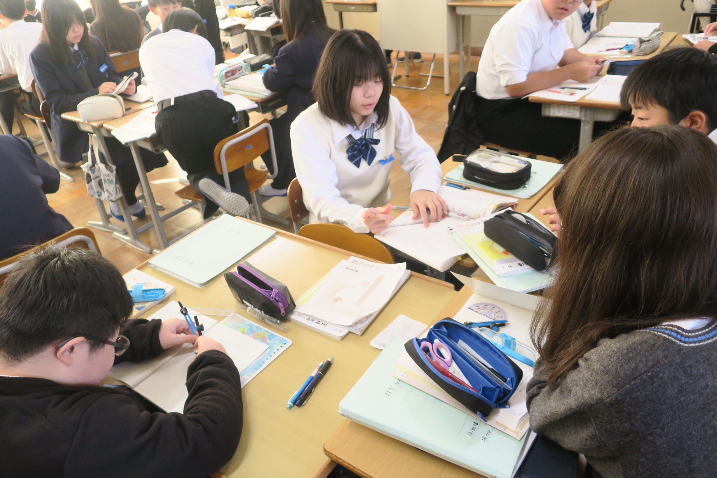 1年1組と2組は数学の授業でした。定規とコンパスを使い垂線を引いていました。先生の説明をもとに実際にノートに作図をしていました。上手く作図ができたでしょうか。