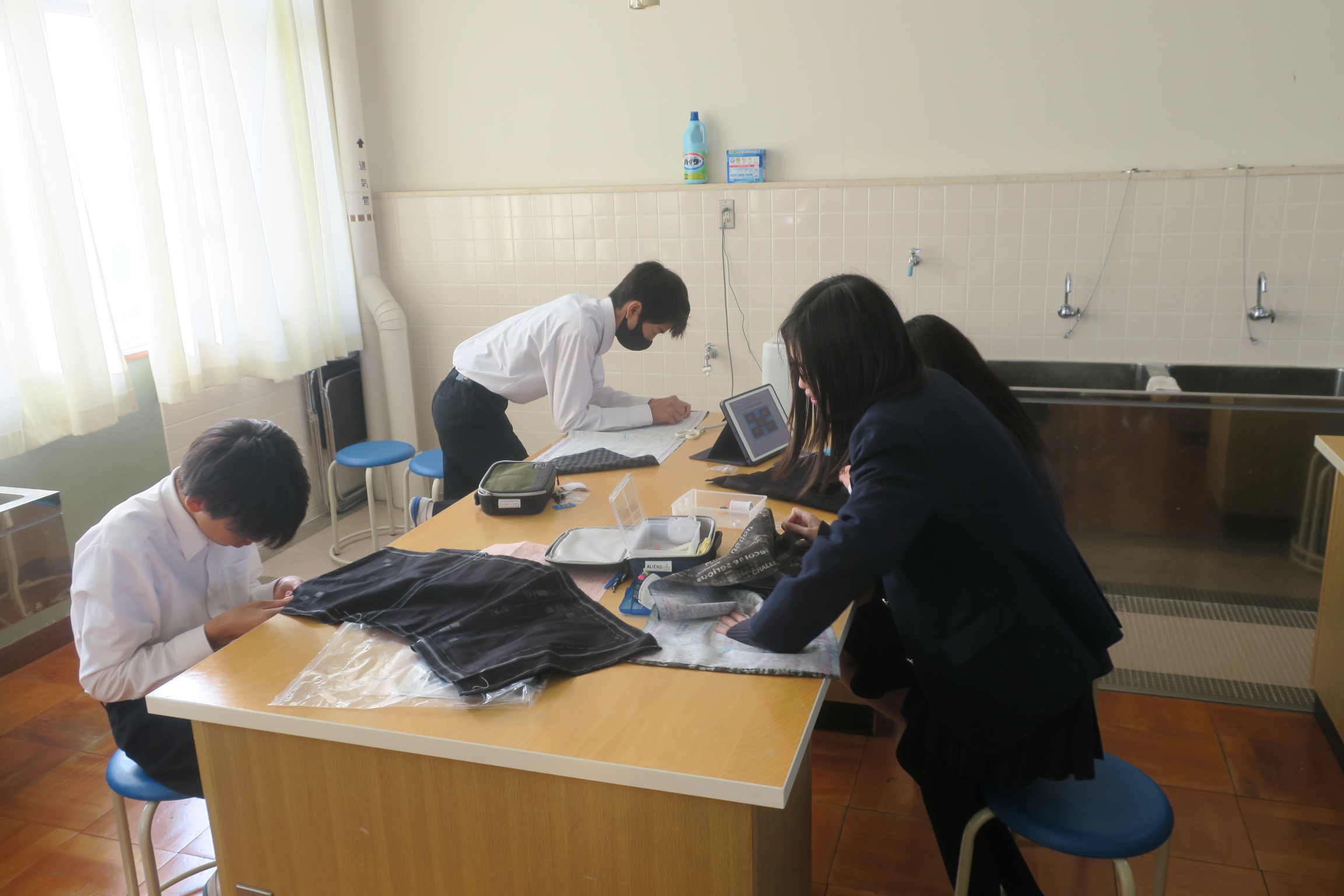 1年3組は家庭の授業でした。ブックカバーを作成していました。アイロンを使いながら縫う作業を進めていました。上手にアイロンを操る人もいました。