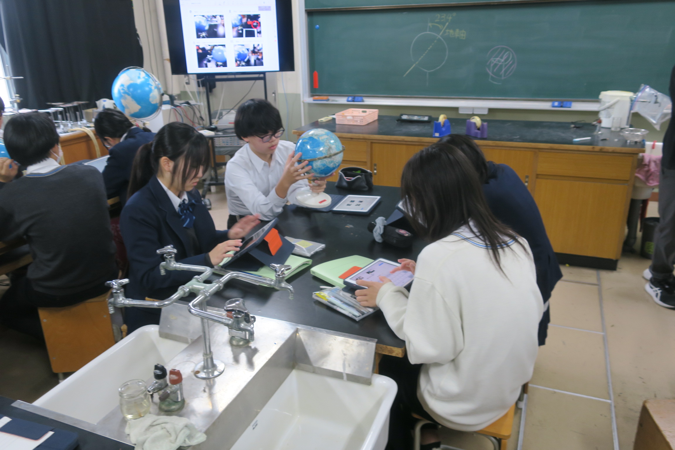 今日の5時間目の授業の様子です。グラウンドから元気な声が聞こえてきます。1年生1組、2組の体育の授業です。各クラス男女各2チームずつに分かれミニゲームをしています。一つのボールを追いかけ、パスをつなぎ、ゴールをねらいます。相手もゴールを決められないように懸命に守っています。全力を出し切る姿は見てる側も元気にしてくれます。3年3組は理科の授業でした。地球儀と太陽の模型を使い季節の変化を確認していました。どうして日本は春夏秋冬=四季の変化があるのかが今日の授業で説明できるのではないでしょうか。