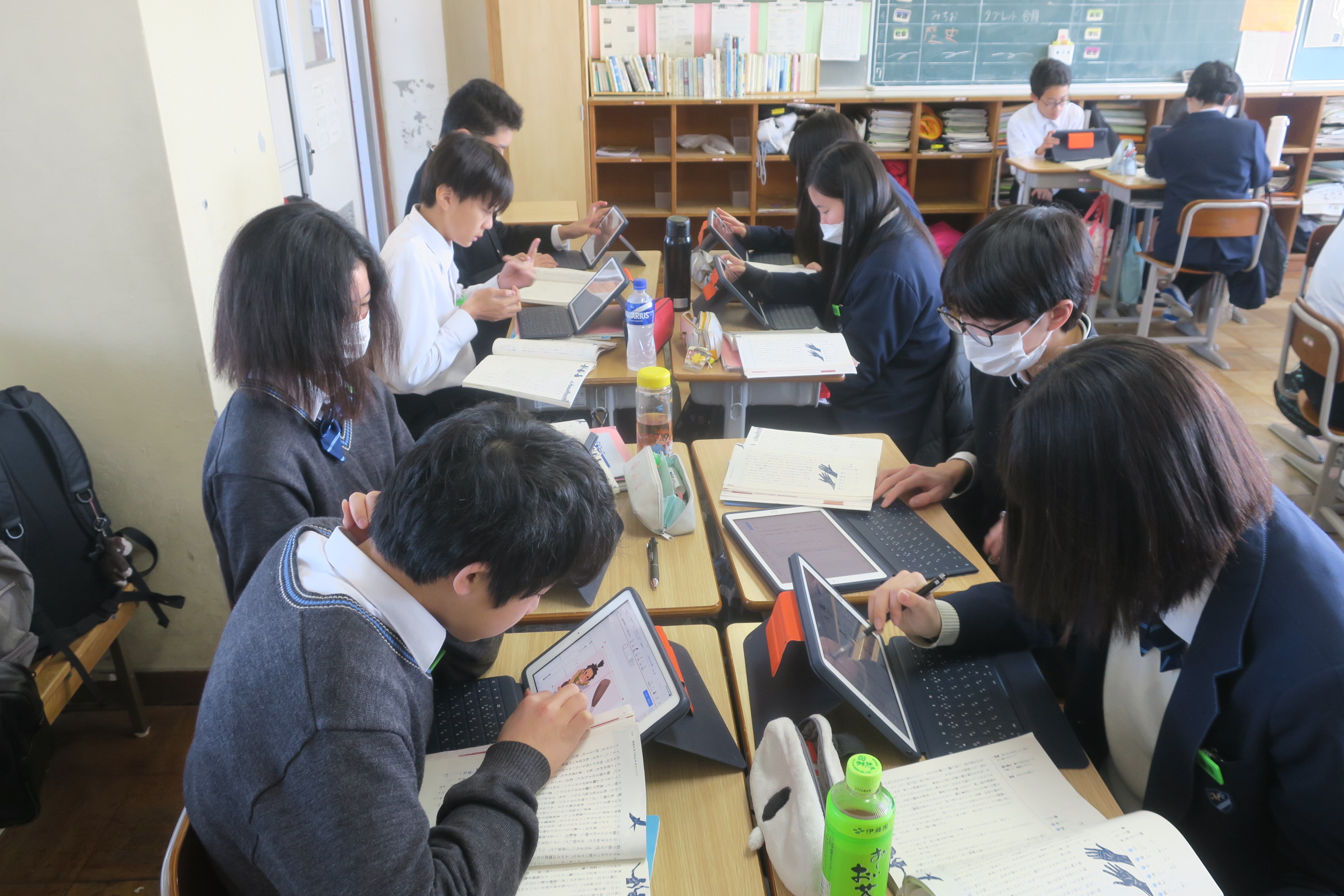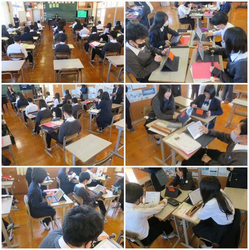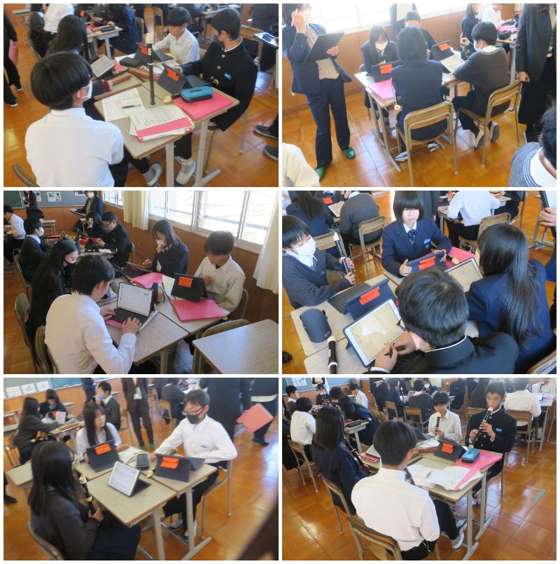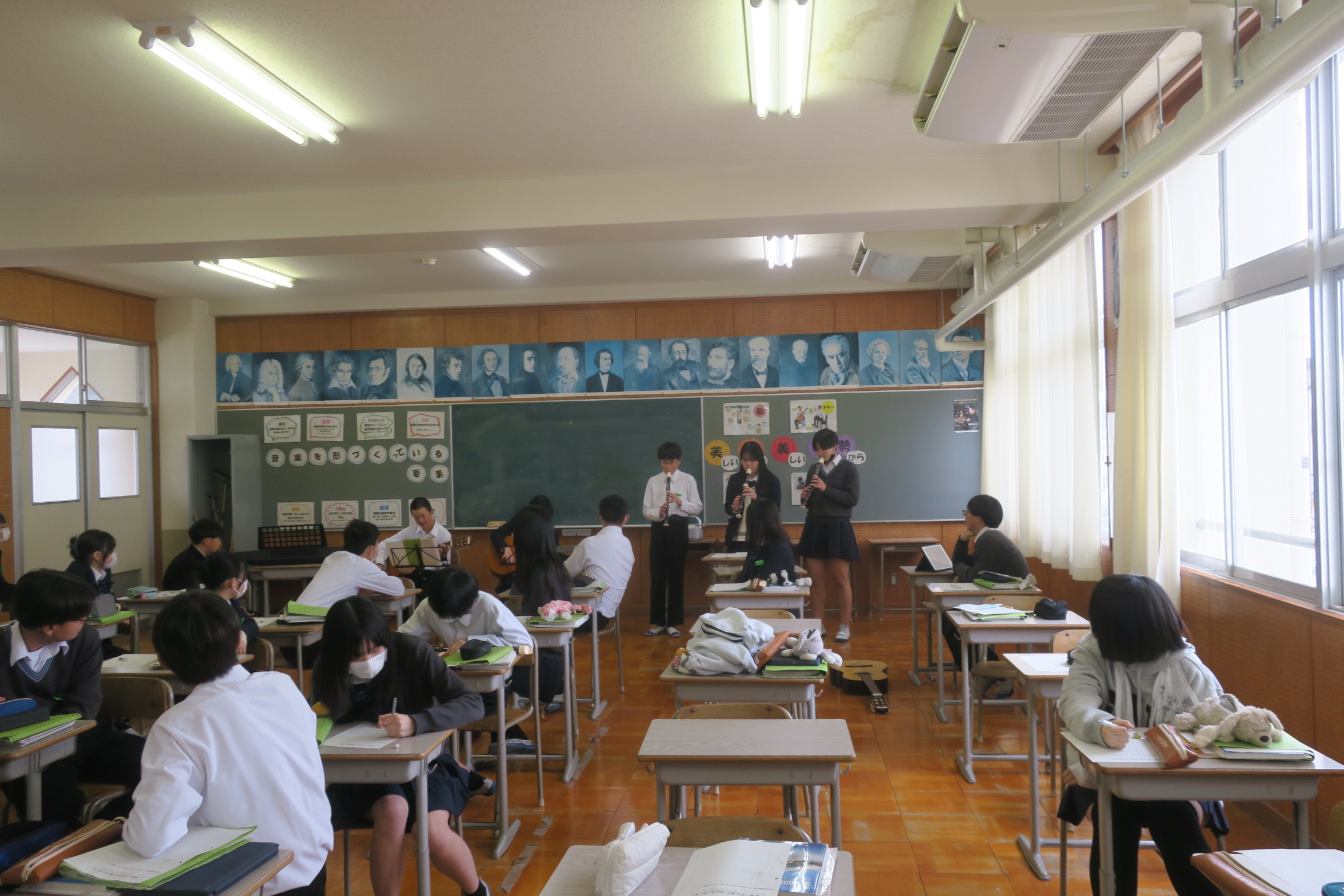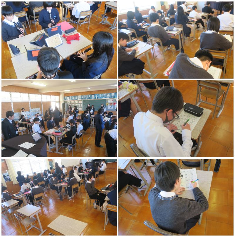 今日の5時間目の2年生の授業の様子です。2年1組は音楽の授業でした。アルトリコーダー、ギター、エレクトーンを使って「サーフィンUSA」を演奏するアンサンブル発表会がおこなわれました。どのグループも特色を出しながら見事に発表をしていました。2年2組は社会の授業でした。明治政府の三大改革は自分はどの改革を推すのかを理由とともに考えていました。2年3組は国語の授業でした。内容は「走れメロス」でした。メロスの心情の変化を絵コンテで表す課題に挑戦していました。