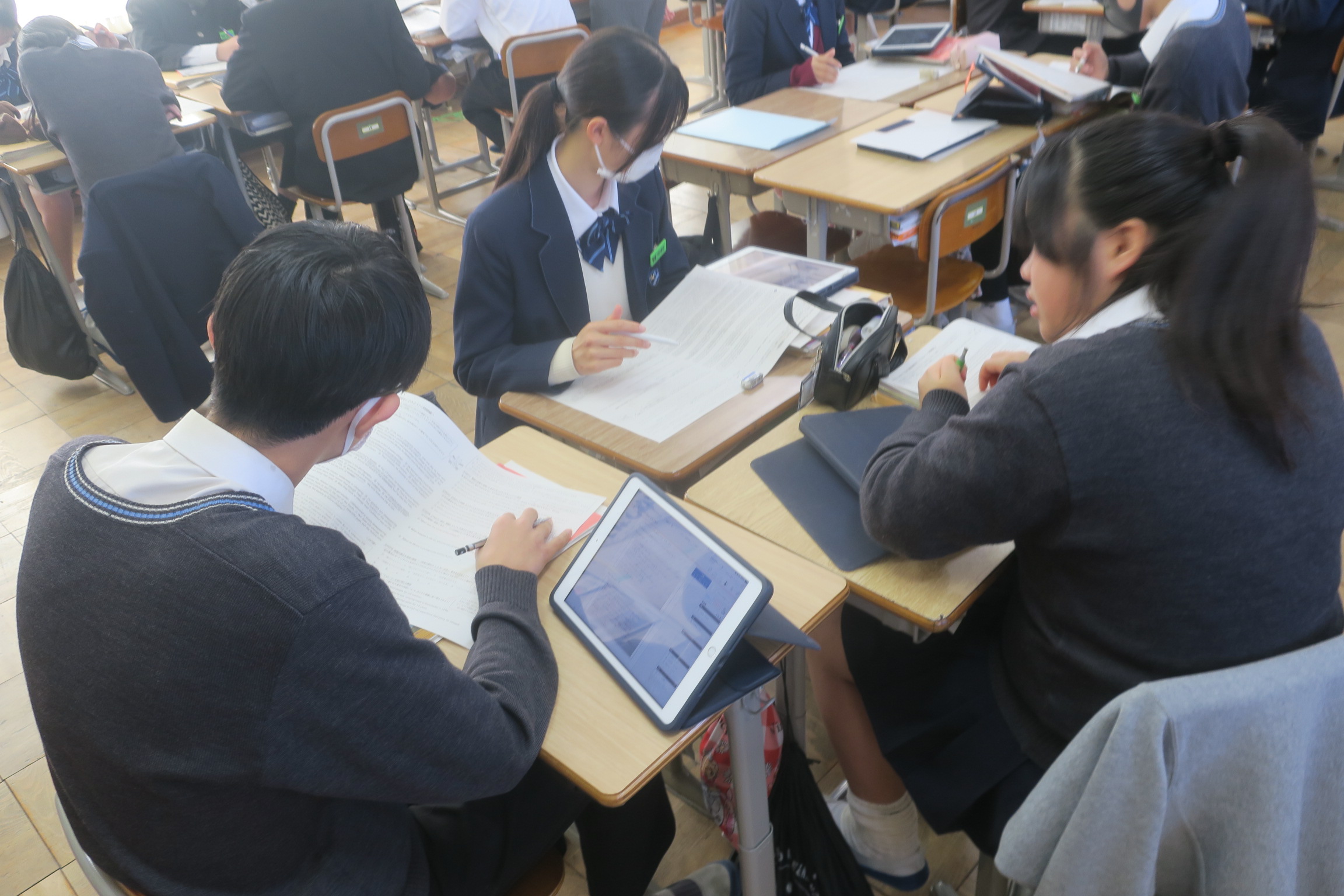 1年3組は理科の授業で、内容は地震でした。震源地から離れているのに震度が大きくなるのはなぜか、という課題についてグループで話し合っていました。