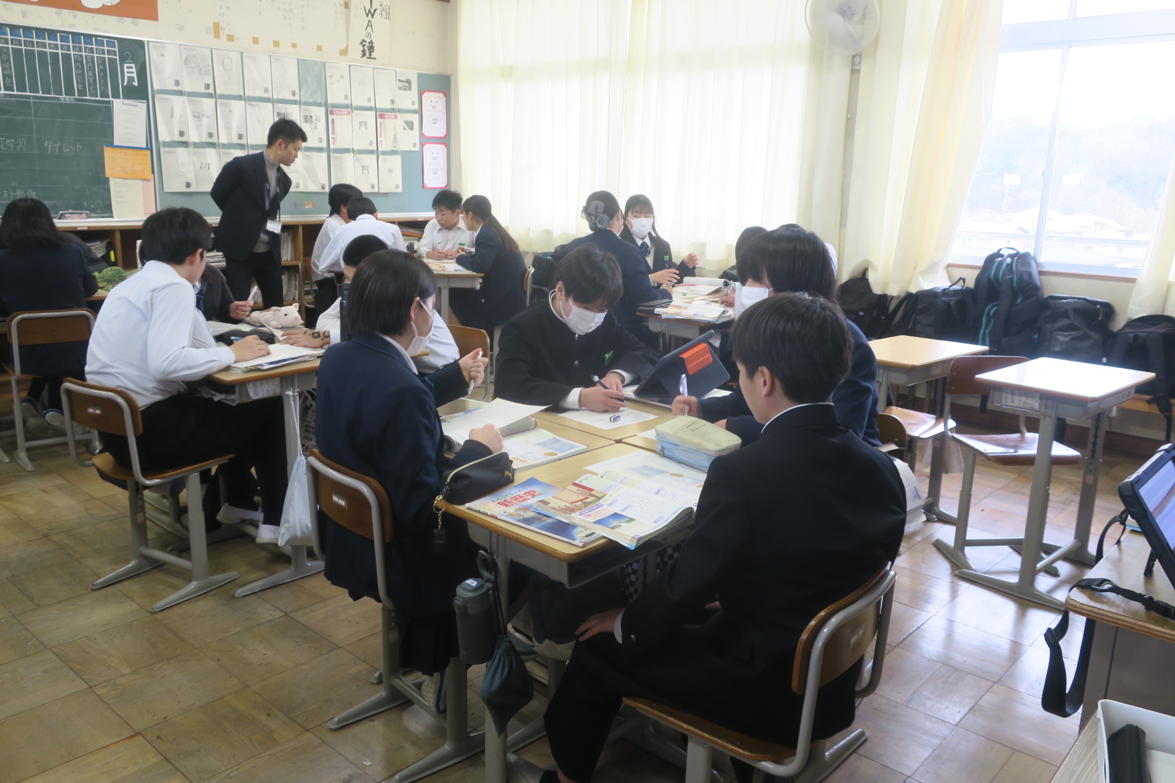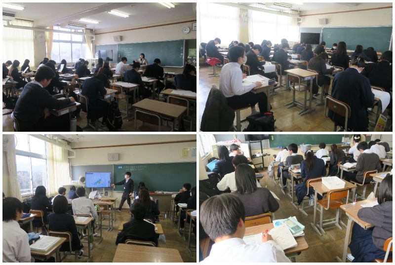 今日は朝から青空が広がる冬晴れとなりました。朝は氷点下まで冷え込みましたが、昼間は気温が10℃を超え、太陽の温もりを感じられる穏やかな一日になりそうです。1時間目の授業の様子です。1年1組・2組は数学で、立体の面積や体積の求め方を確認しながら、教科書やワークの問題に取り組んでいました。分からないところを先生や仲間に教えてもらう姿も見られました。1年3組は社会でオーストラリアについて学習し、白豪主義の意味を確認しながら、なぜオーストラリアには白人が多いのかを資料をもとに考えていました。1年4組は理科で、火山の噴火によって堆積してできた火成岩について、実物を観察しながら特徴を調べていました。