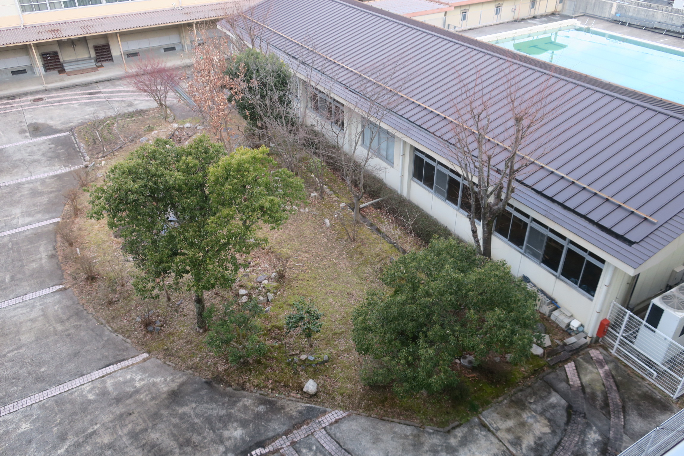 去年から始まった中庭プロジェクト。2学期の終わりに真野北学区のみなさんを中心に中庭の草刈りや木の剪定(せんてい)がおこなわれました。中庭がすっきりしました。今日と明日でPTAの協力をいただいて真野学区の地域の方(保護者)が中庭の改良工事をしていただきます。きれいになった中庭にはベンチとパラソル、プランターを置き「真野中生の憩いの場」になる予定です。どのように生まれ変わるのかを楽しみにしておいてください。