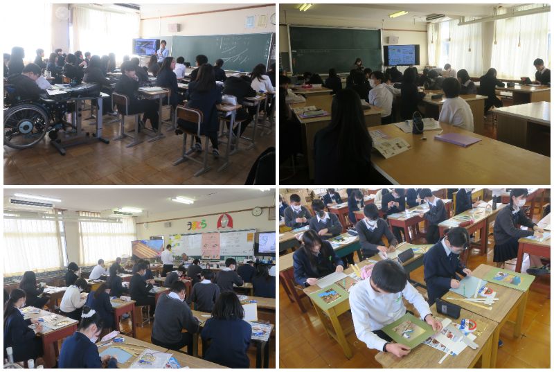 2年1組は技術でLEDキーホルダーの製作に取り組んでいました。木製部分を自分のデザインした形に加工する作業に集中して取り組んでいました。2年2組は国語で「走れメロス」を学習し、メロスの心情の変化を絵コンテで表す課題に挑戦していました。2年3組は英語で、グループごとに長文読解に取り組み、苦戦しながらも協力して読み進めていました。