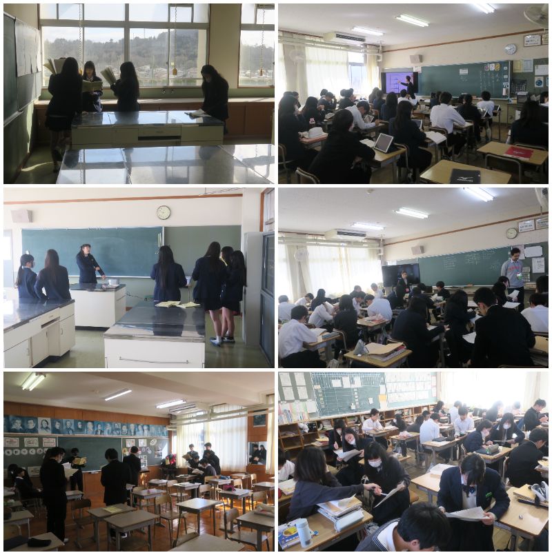 3年1組は理科、3年2組は国語、3年3組は社会の学年末テストが返却され、その後は入試に向けたまとめの問題に取り組んでいました。