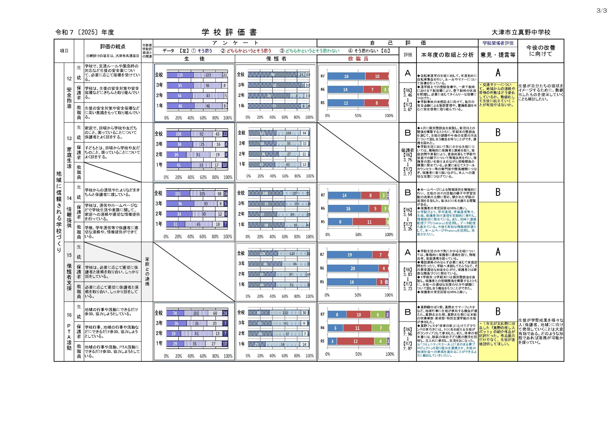 いただいた評価やご意見を踏まえ、今後も真野中学校の教育活動の充実と改善に努めてまいります。