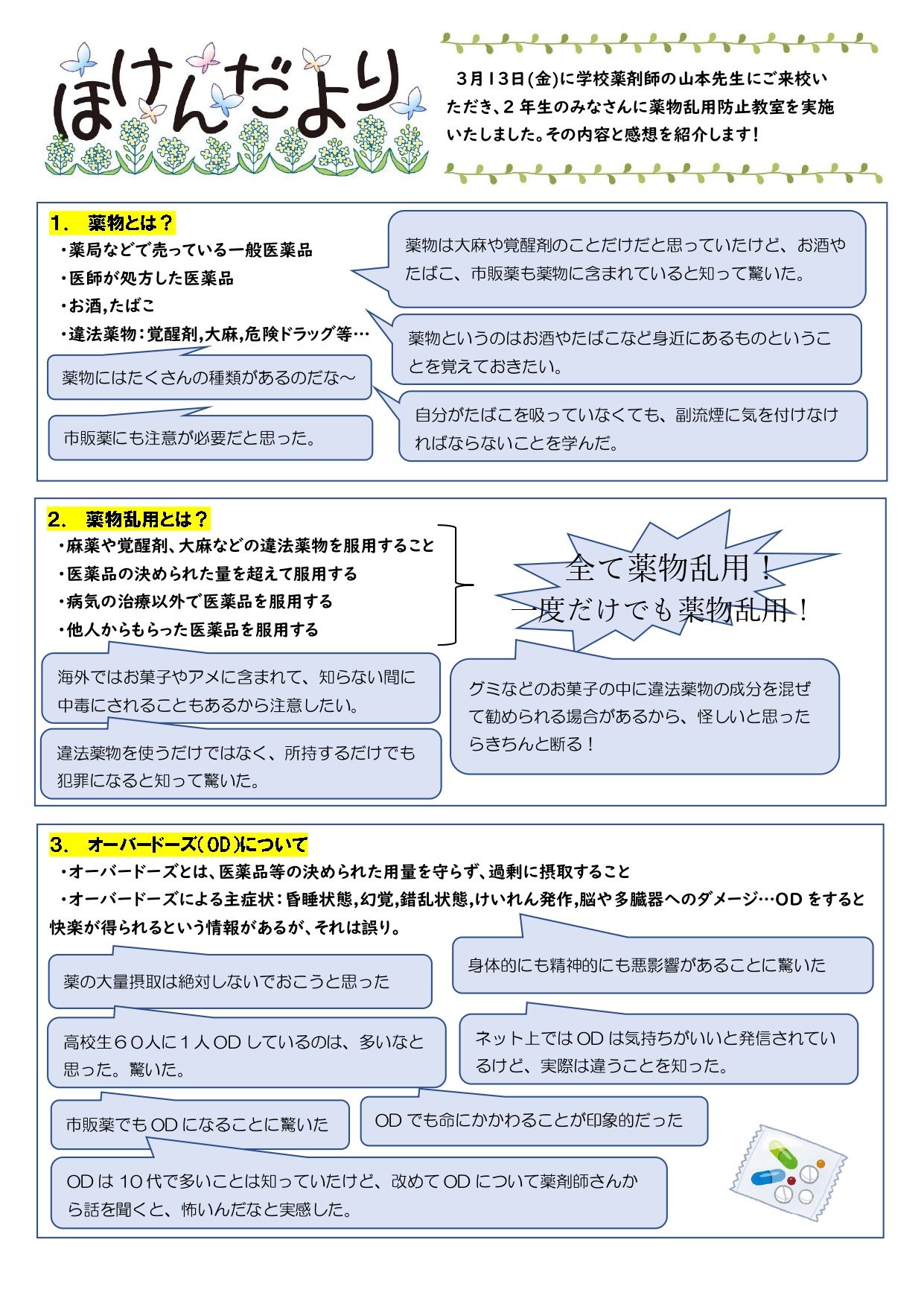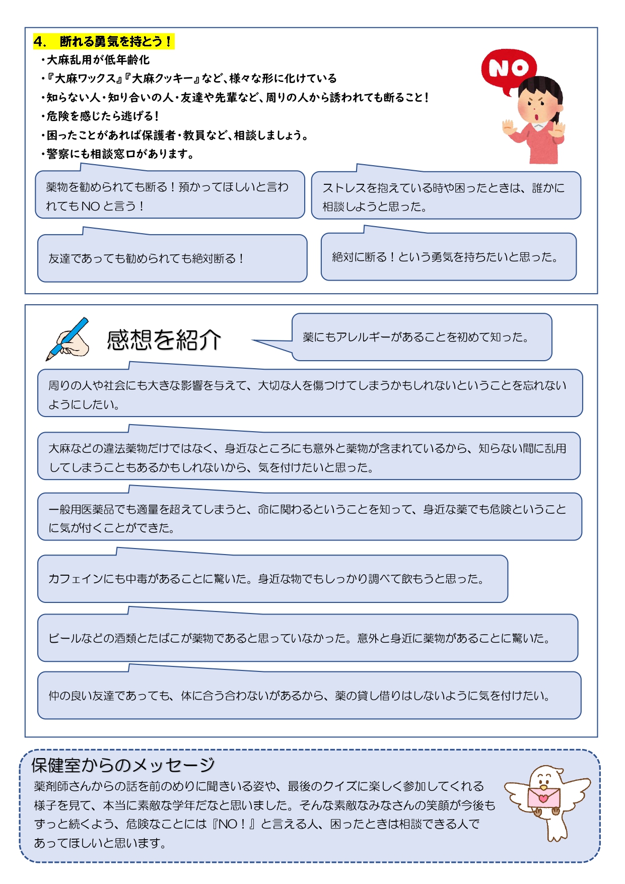 今回の「ほけんだより」では、授業で扱った内容だけでなく、家庭で話し合っていただきたいポイントや、子どもたちが危険から身を守るための具体的な行動例も掲載しております。ぜひご家庭でもご一読いただき、薬物の危険性について理解を深めていただくとともに、お子さまと話し合うきっかけとしてご活用いただければ幸いです。