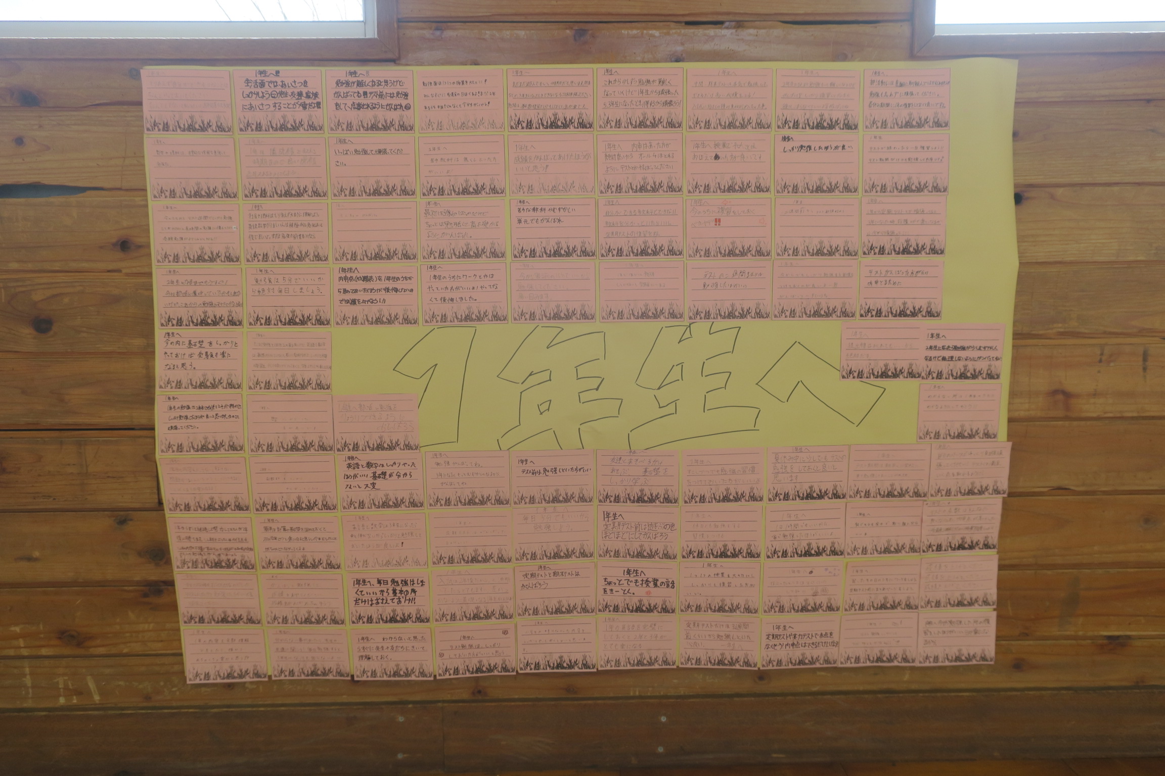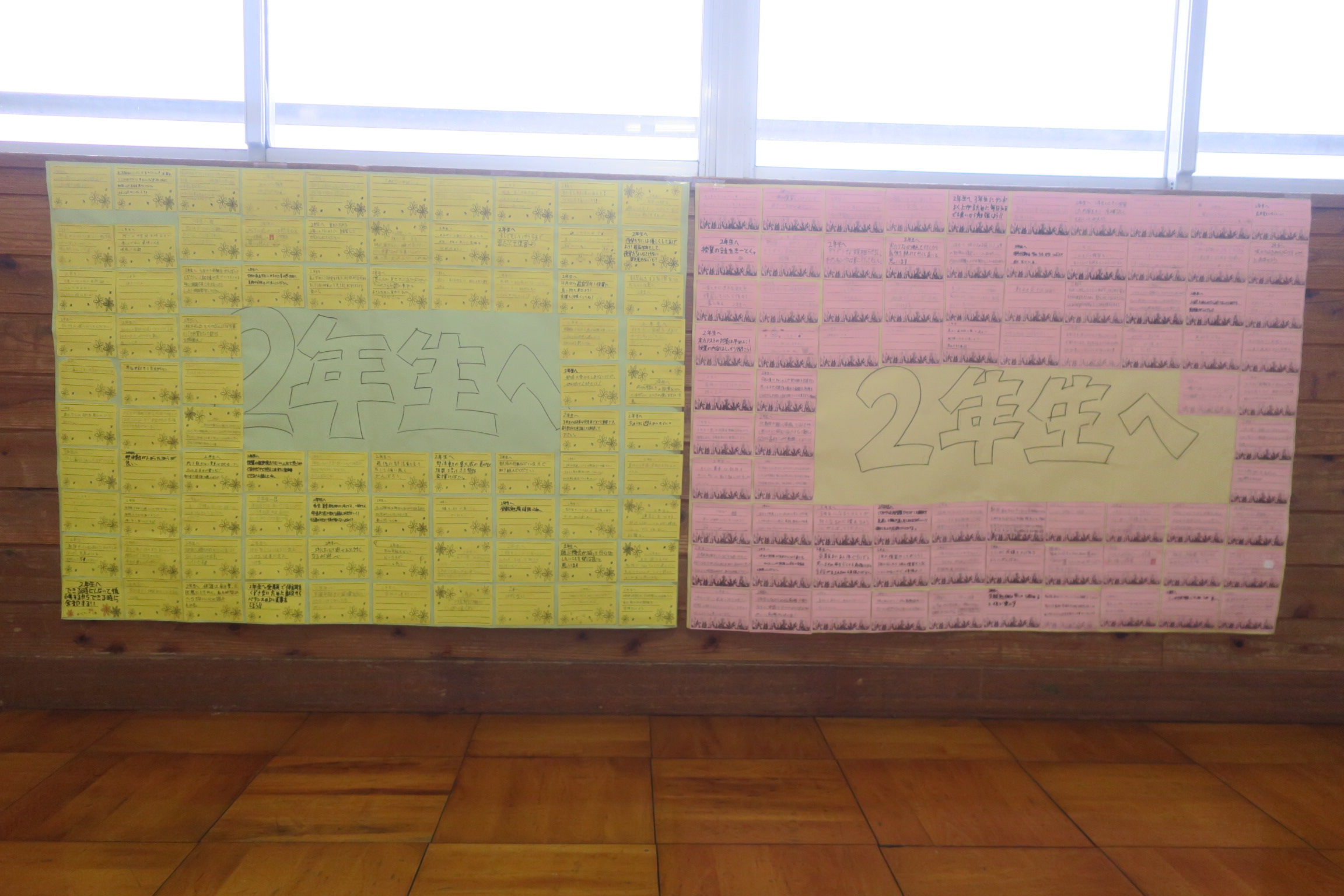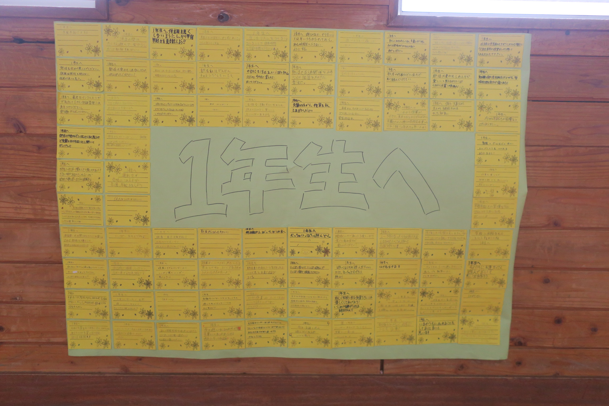 3年生が、1・2年生に向けて書いてくれたメッセージが、それぞれのフロアに掲示されています。「授業は大切にしたほうがいい」「進路のことは早めに考えておいたほうがいい」「3年生になると部活があっという間に終わるから、毎日の練習を大切にしてほしい」「みんなのことを考えて、むやみに騒がないほうがいい」「友達を大切にしてほしい」…など、3年生が実際に経験した“うまくいったこと”や“後悔したこと”が、心のこもった言葉で書かれています。自分たちの歩んできた3年間をふり返り、後輩に伝えたい思いをまっすぐに届けてくれました。