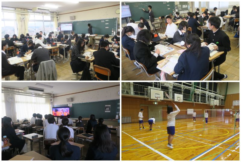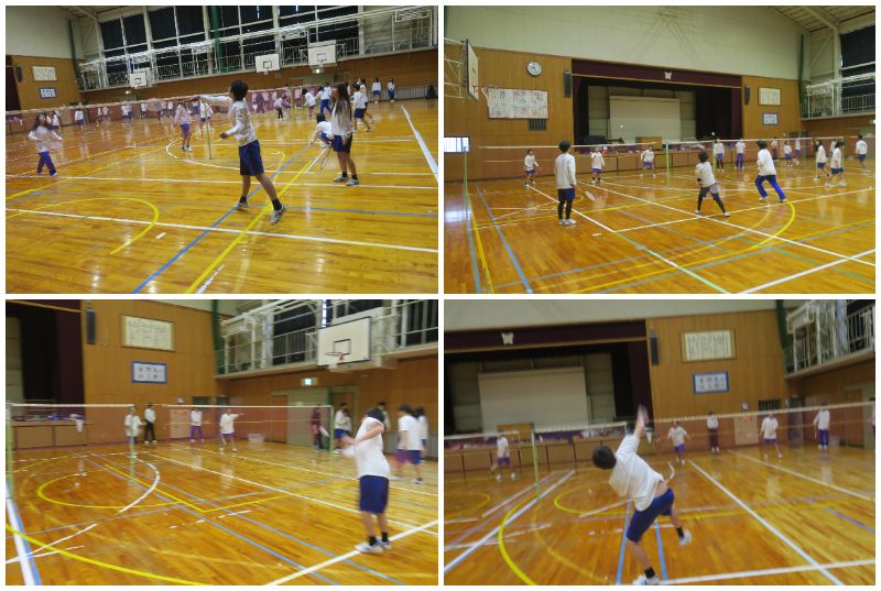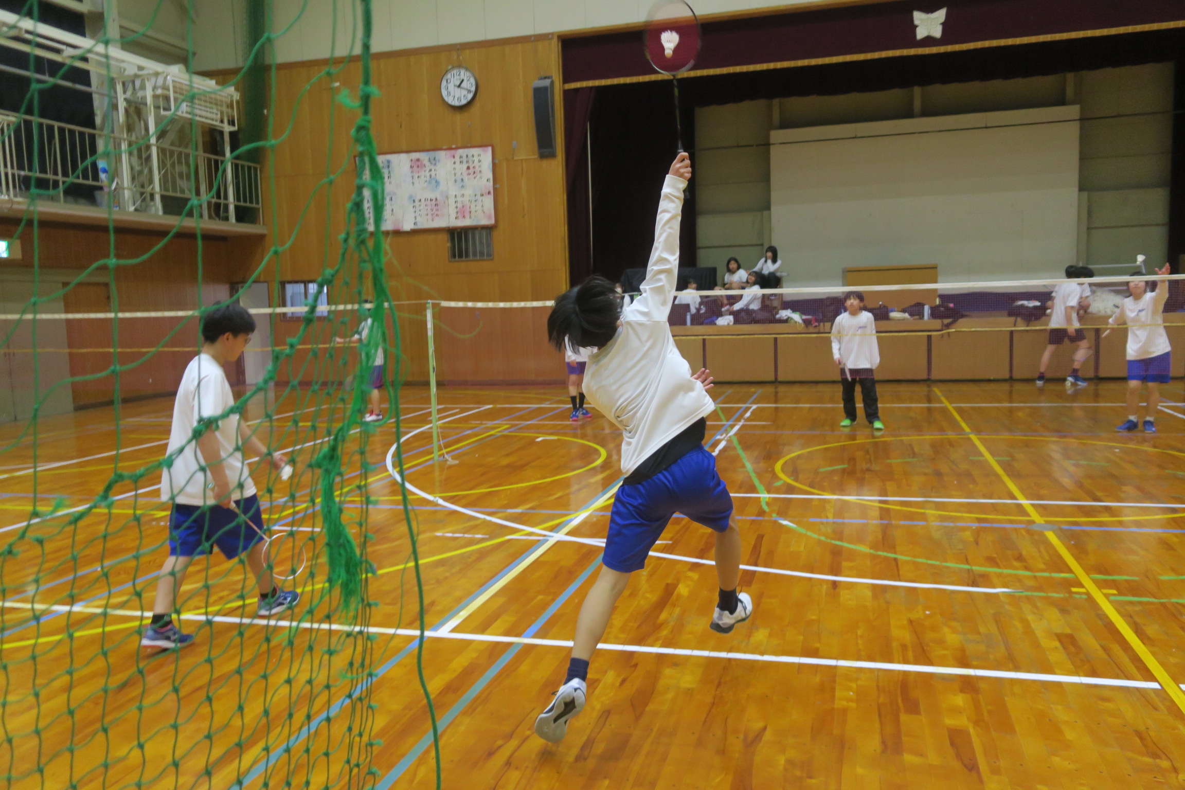 1年3組と4組は体育で、バドミントンの授業でした。ダブルスやシングルスのゲームを交代しながら楽しんでおり、担任の先生も加わって一緒にプレーするなど、笑顔があふれる時間となっていました。