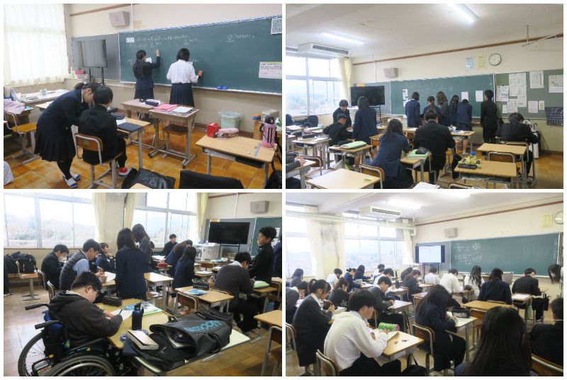 5組は数学の授業で計算問題に取り組んでいました。解けた生徒から黒板に解き方を書いていき、互いに学び合う姿が見られました。