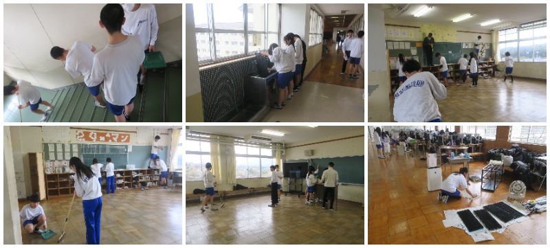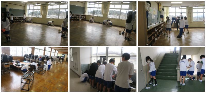 今日は3時間日課です。3時間目は大そうじです。体操服を忘れないようにしてください。自分たちが毎日を過ごした教室、特別教室、トイレ等を心を込めてきれいにしてください。部活動がある人はお昼の用意を忘れずにもってきてください。部活動の完全下校は14時15分です。終了時間も1時間早まりますので間違えないようにしてください。