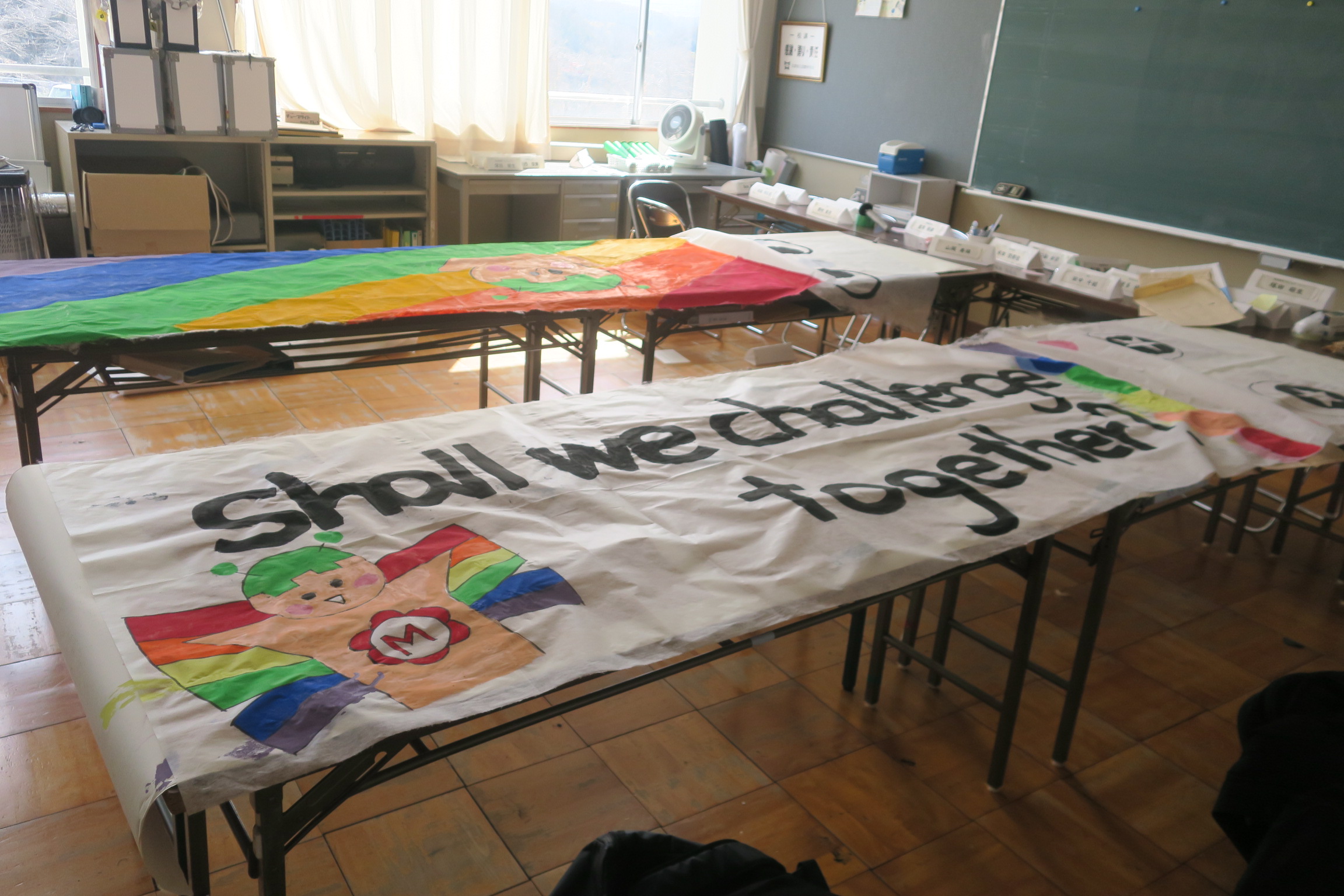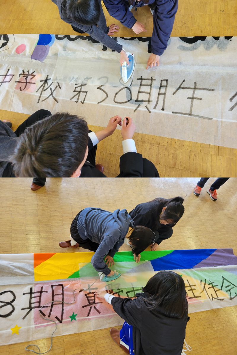 また、生徒会は鯉のぼり祭りに向けて3月4日に2匹のカラフルな鯉のぼりを作成しました。今日は真野市民センターで鯉のぼりつなぎ作業に参加します。よろしくお願いします。