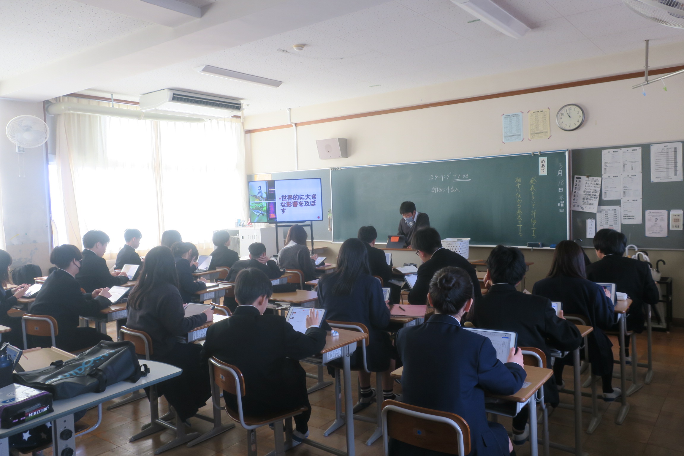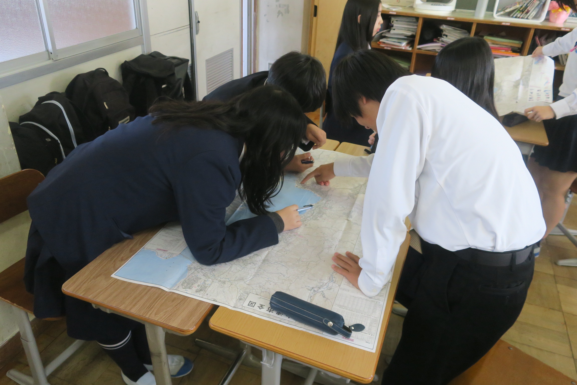 今日は朝から青空が広がっています。気温もぐんぐん上がっています。今日は暖かな陽気になりそうです。今週は雨の日もありそうですが春のような気温が続くようです。桜の開花のニュースも聞こえてきそうです。今日の1時間目の授業の様子です。1年1組は美術の授業でした。1年間の振り返りの時間でした。振り返りプリントに授業の反省と先生への評価を記入していました。1年2組は社会の授業でした。内容は「地形図の見方」でした。大津市の2万5千分地形図で真野中学校や地図記号をもとにいろいろなものをグループで探していました。1年3組は国語の授業でした。1年生で学んだ単元から自分の好きなものを選び、資料を作成してみんなに分かりやすいようにプレゼンする授業でした。クイズや自分の考察も入れながらとても分かりやすく説明していました。1年4組は数学の授業でした。内容は確率でした。問題を解きながら分からないところを教えアイナが学習を進めていました。