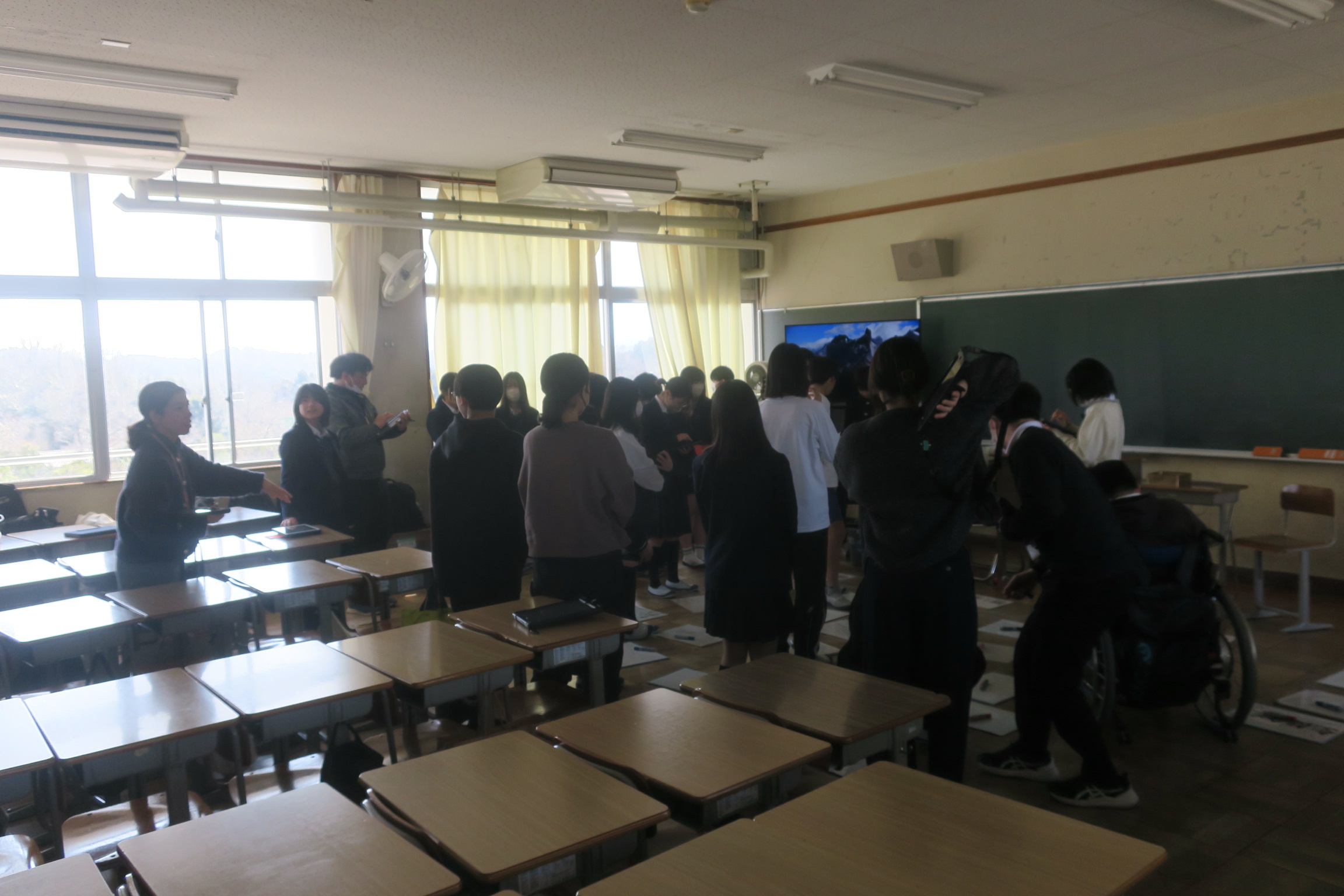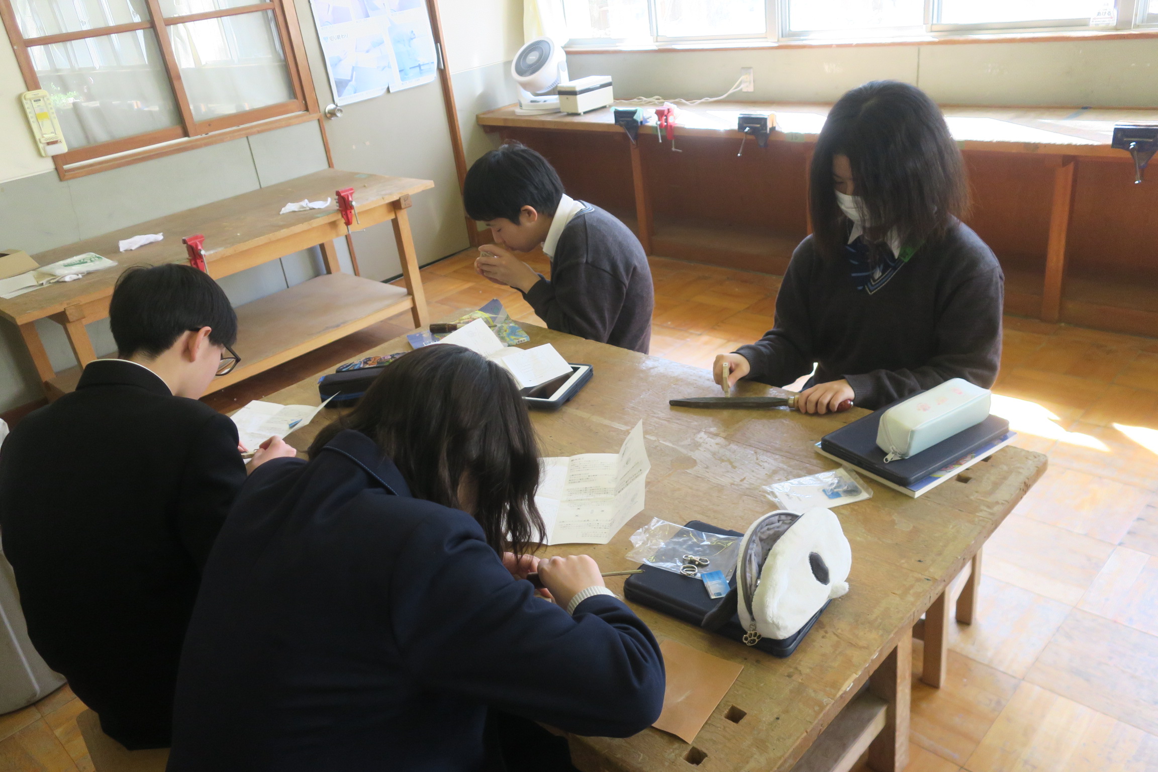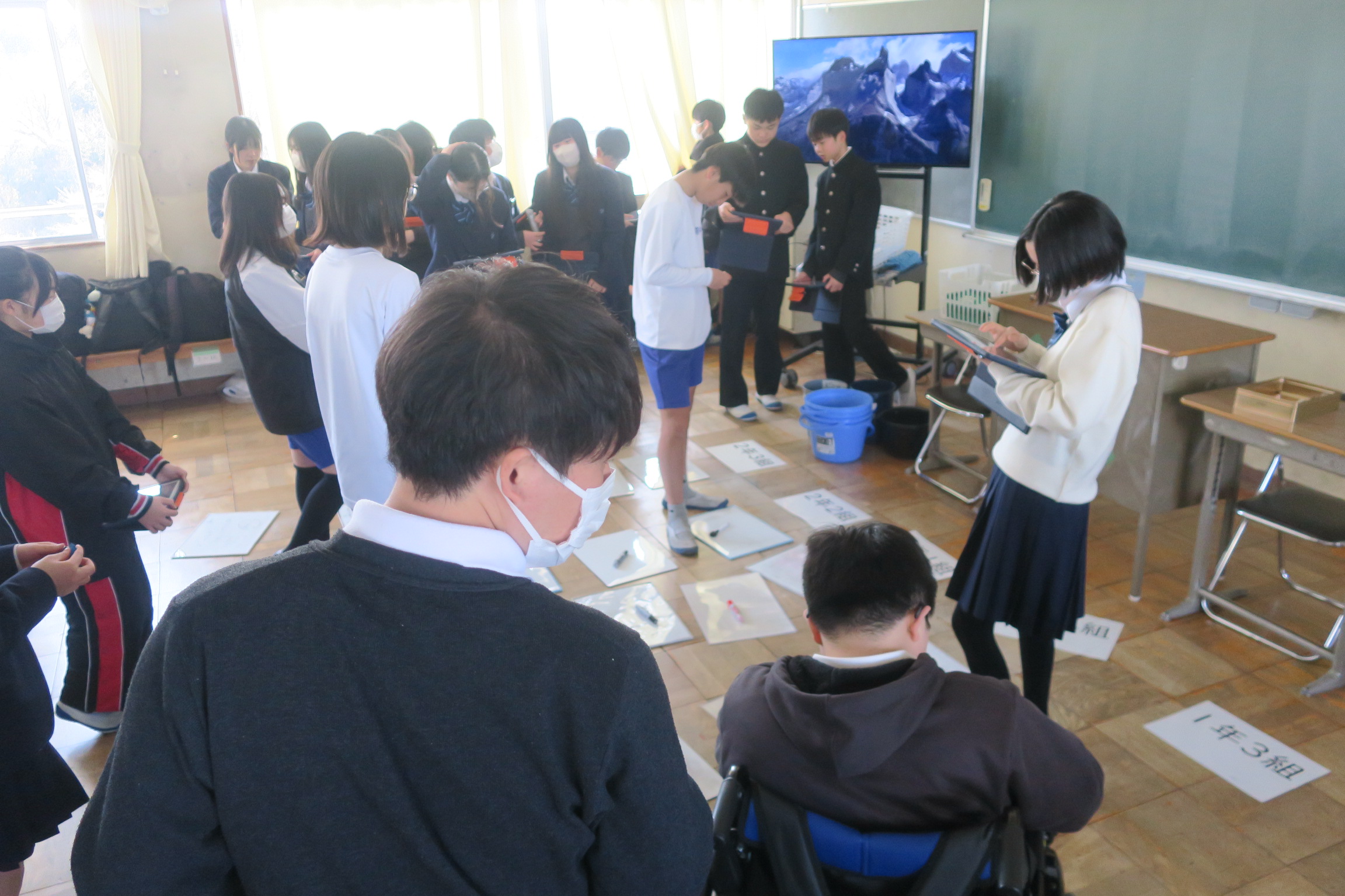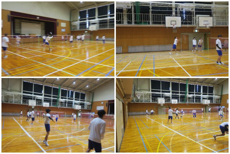 2年1組は英語の少人数の授業でした。英文を条件に従って置き換え、どのような意味になるかを発表する内容でした。先生に手助けしてもらいながら発表をしていました。2年2組は技術の授業でした。内容はLEDライト付きのキーホルダーづくりでした。集中して最後の細かい作業に取り組んでいました。2年3組は体育の授業でした。内容はバドミントンでした。シングル、ダブルス、混合ダブルスに分かれて勝負を楽しんでいました。温かな良い雰囲気でした。