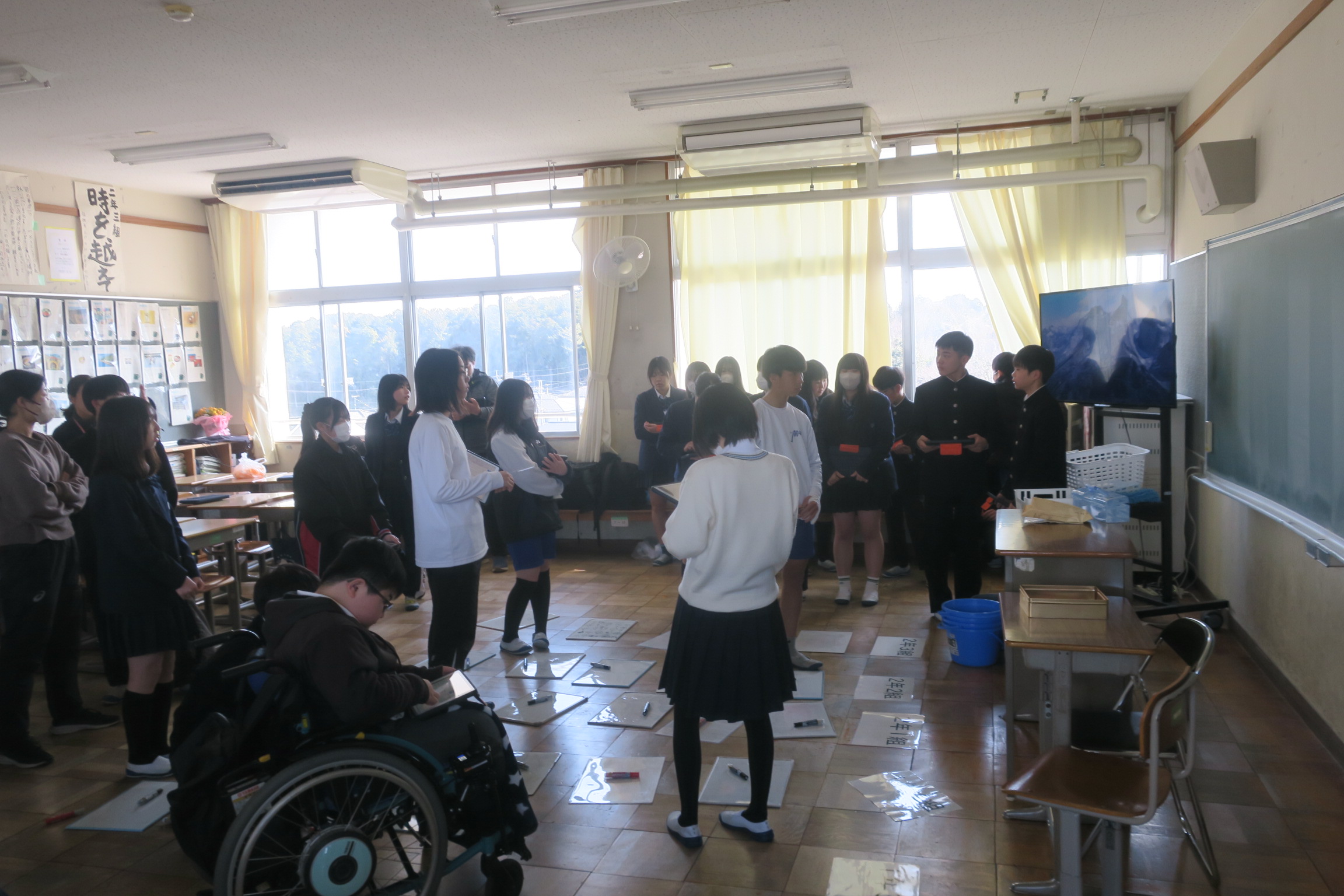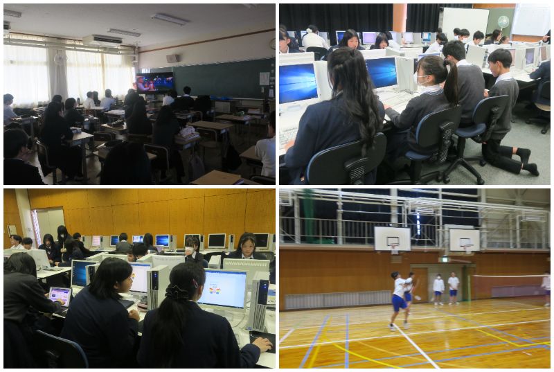 2年1組は家庭の授業でした。キャッシュレス決済について学んでいました。簡単にできてしまうキャッシュレス決済の落とし穴に落ちないように学んでいました。2年2組は英語の授業でした。「リベンバーミー」の映画の英語版を鑑賞していました。2年3組は体育の授業でした。シングル、ダブルス、混合ダブルスのトーナメント戦をおこなっていました。みんな生き生きと活動をしていました。