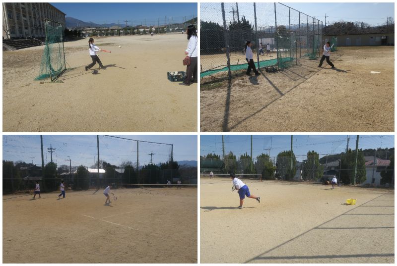 陸上競技部は補強運動やミニハードルで基礎を固めた後、短距離は力強いダッシュ、中長距離はリズムを意識したペース走に取り組んでいました。ソフトテニス部はファーストサーブ、レシーブ、ボレーといった基本技術を交代しながら丁寧に練習し、技術の向上を目指しています。ソフトボール部はトスバッティングを順番に行い、バットの振りやミートの感覚を確かめながら練習を重ねていました。