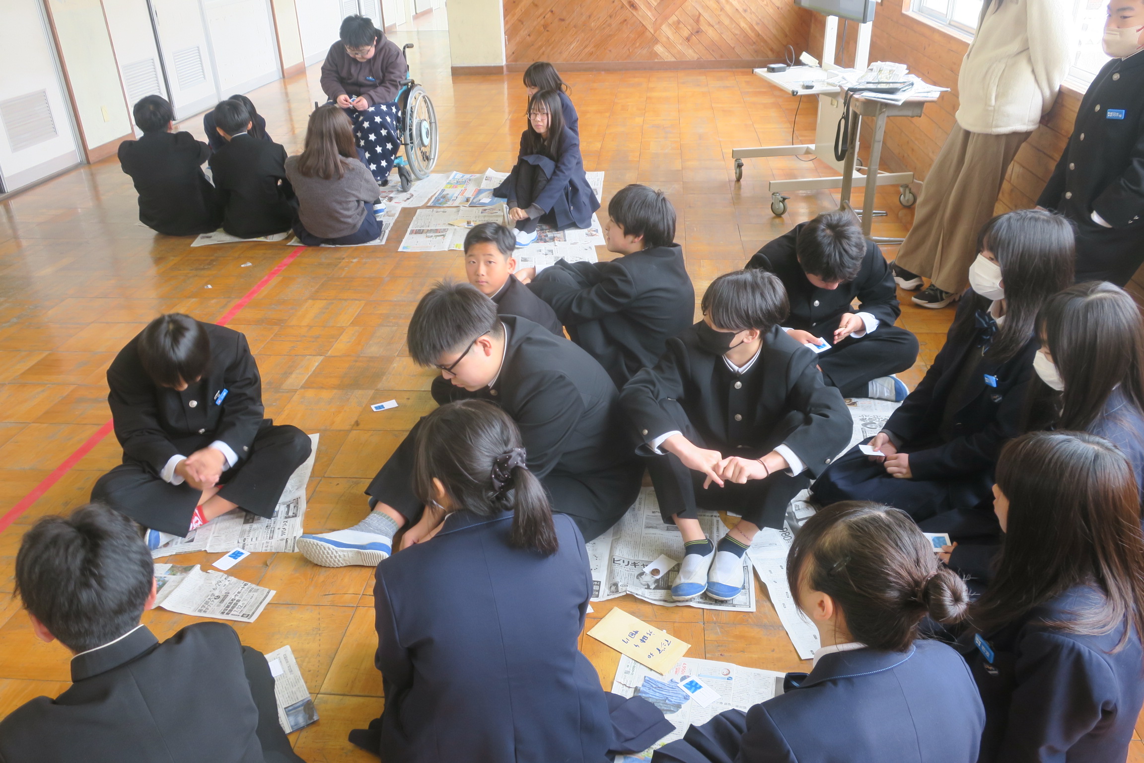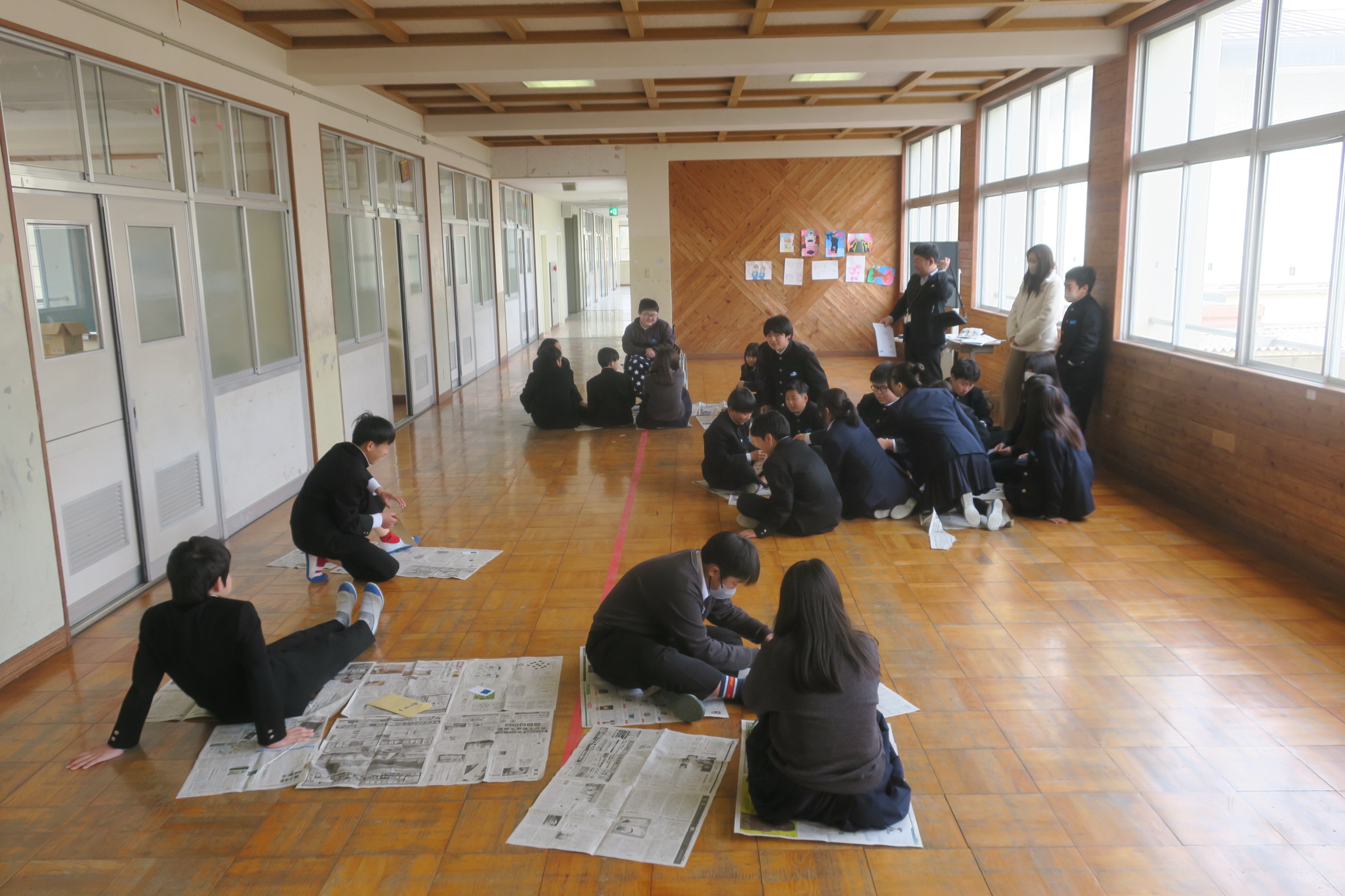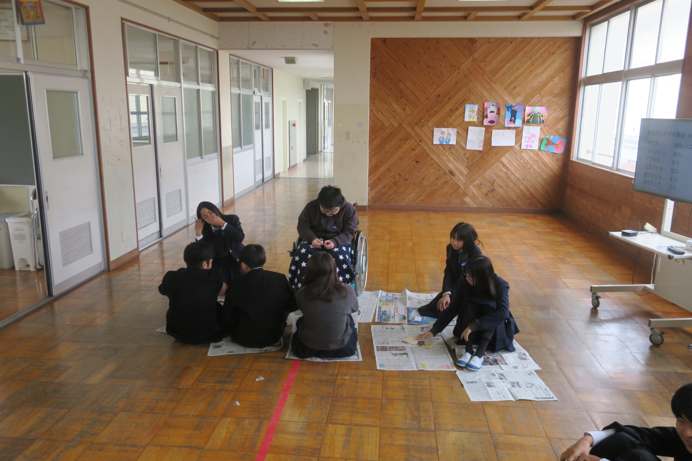 フロアーに大陸と大きさと同じ新聞紙を引きカードに示された指示に従ってそれぞれの大陸、大陸にある国がどのような状況下を作業を進めながら確認をしていました。