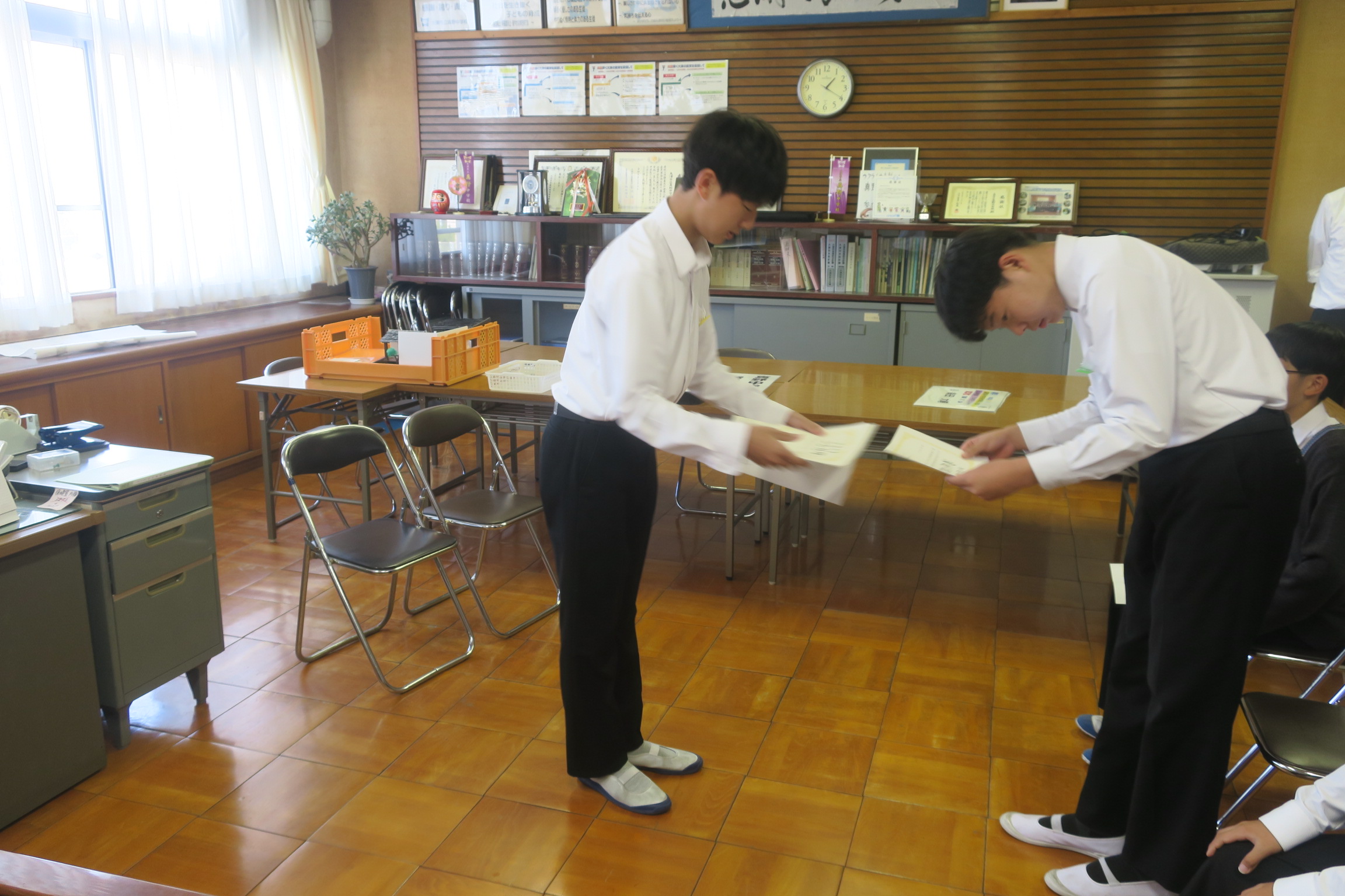 今日の昼休みに昨日の生徒会役員選挙で当選した会長、2年生副会長、1年生副会長の認証式行いました。はじめに選挙管理委員長から当選通知書が渡されました。続いて、校長先生から認証書が渡されました。