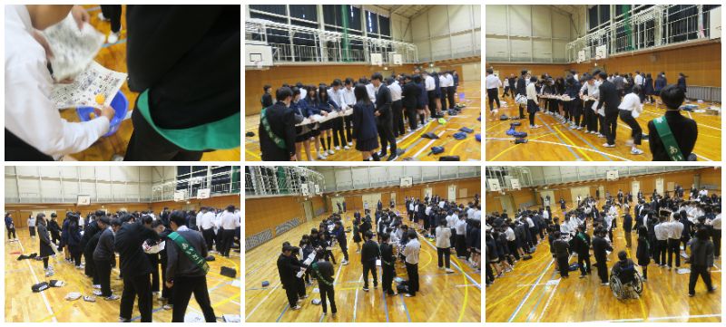 続いて行われたのはイントロクイズでした。流れてくる曲の最初の数秒を聴き取り、班のメンバーで意見を出し合いながら回答を書き込んでいきました。曲名がわかった瞬間に「あっ!」と声が上がるなど、体育館は大いに盛り上がりました。