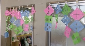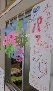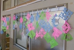 1年生が図画工作科の学習で取り組んだ作品です。おりがみを折りたたんでから切りましたので、おりがみを開いてみるまで、どんな模様ができているかわかりません。「わ〜こんなもようになった!」「おもしろいかたちになったよ」と楽しみながら作品づくりに取り組んだ1年生です。