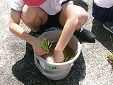 今年も5年生がバケツを使った米作りに挑戦します。JAの方に来ていただき、いろいろと教えていただいています。先週は苗植えのために土の準備をしました。そして今日、一人ひとり自分のバケツに苗を植えました。植えるコツはJAの方に教えていただきました。大変なのはこれから。自分が植えた苗の世話をしていきます。お米がどのように作られているのか、これから秋の収穫まで、半年にわたる学習のスタートです。