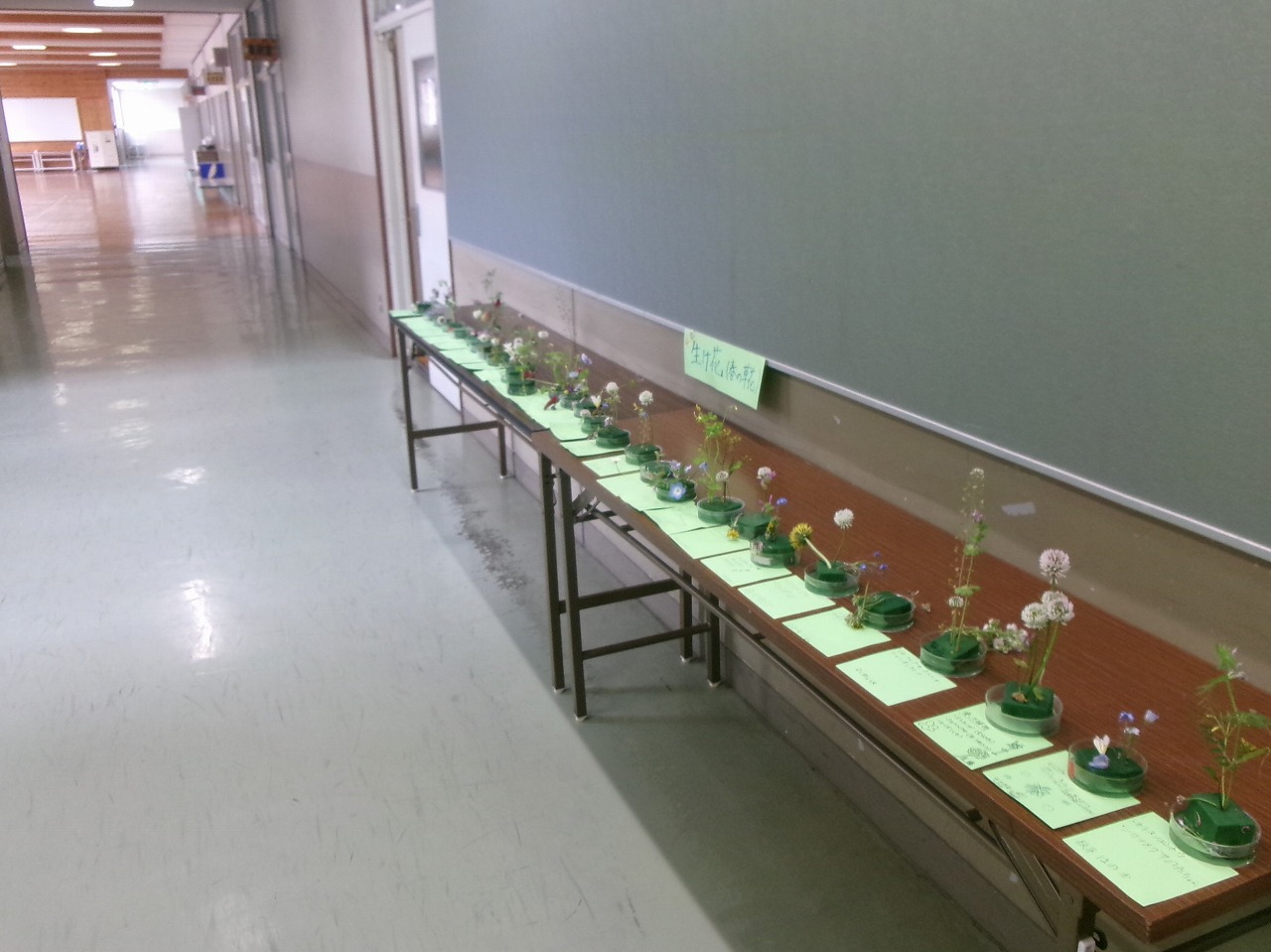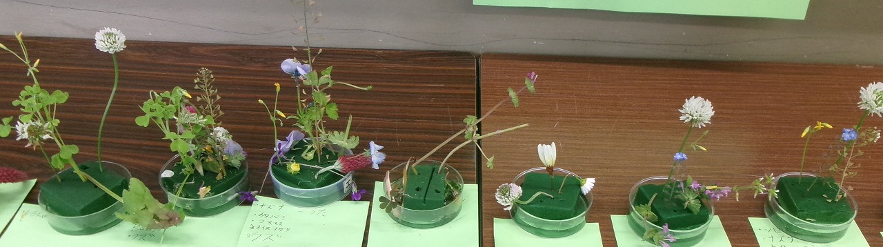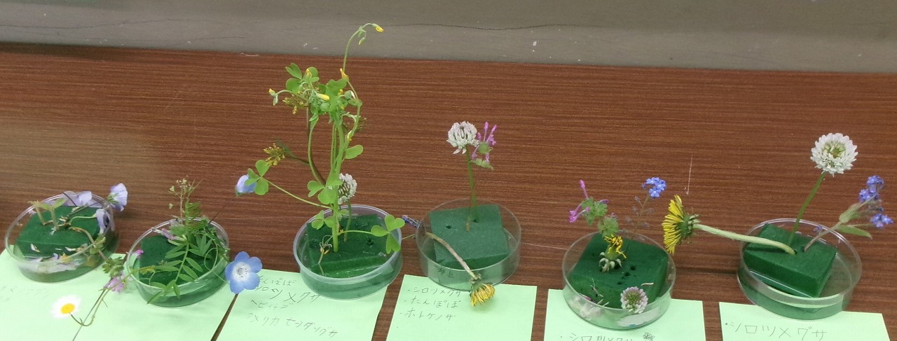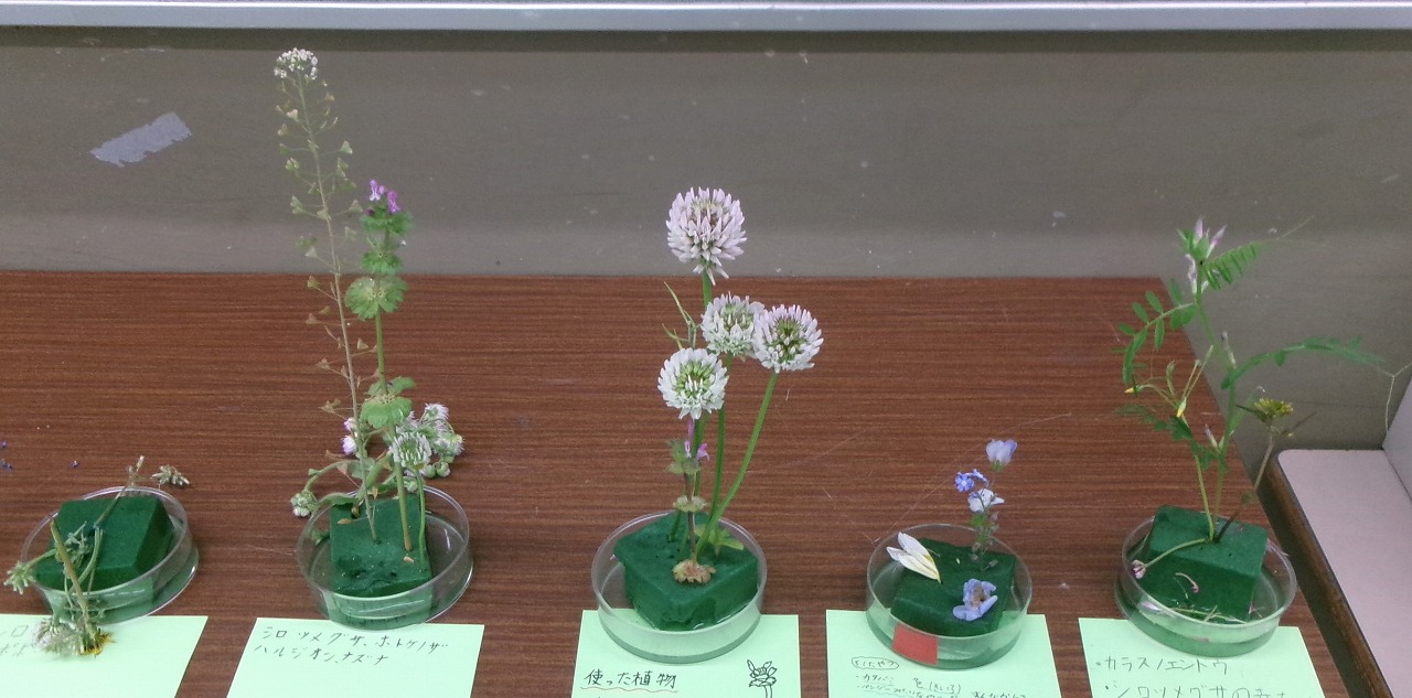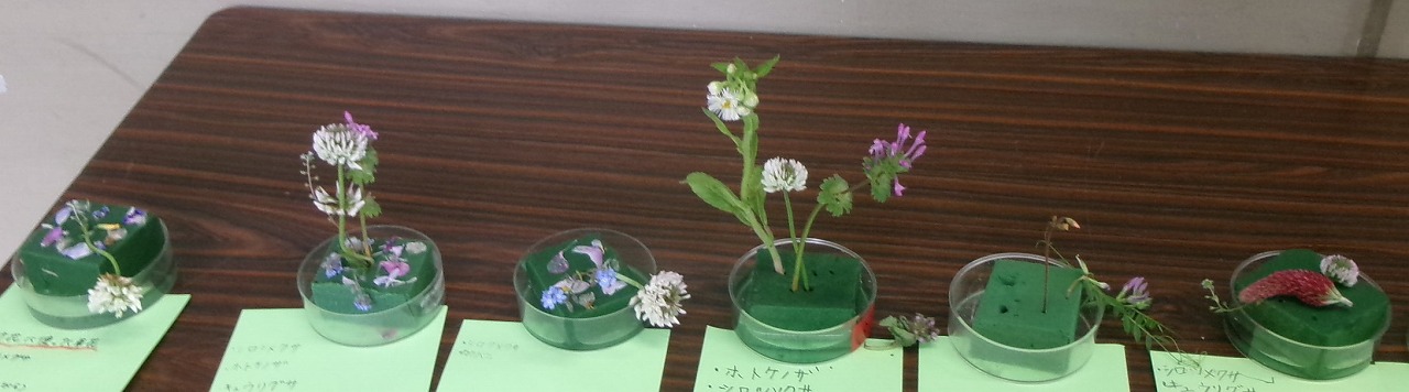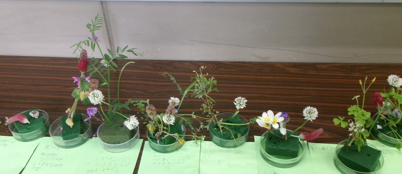 職員室前の廊下で、春の野草を使った生け花展が開かれています。4年生の理科の作品です。思い思いの野草を摘んできた子どもたちは、野草の名前を調べ、思い思いに生けました。素敵な作品がならんでいます。