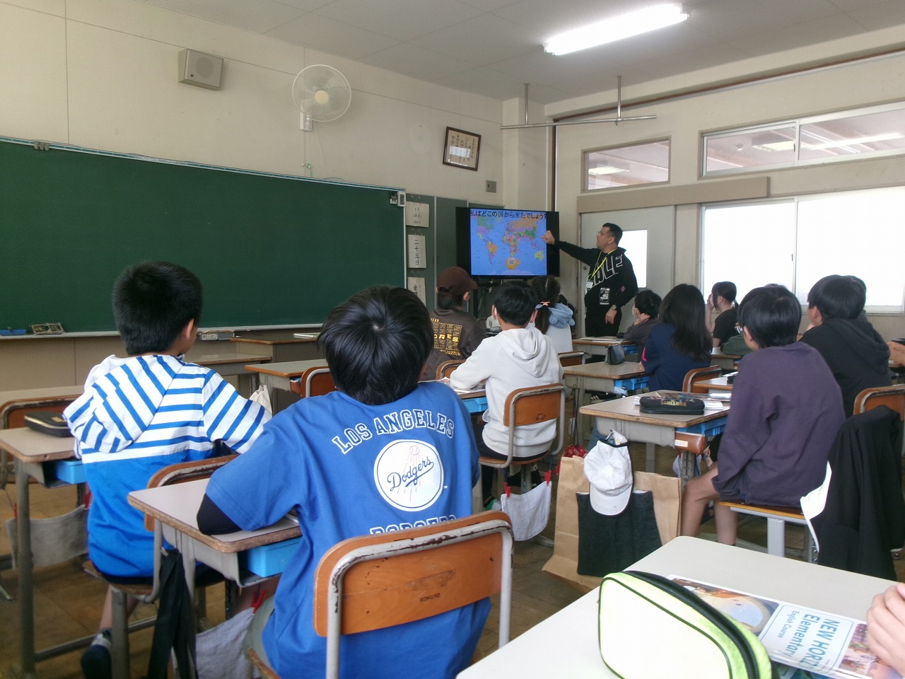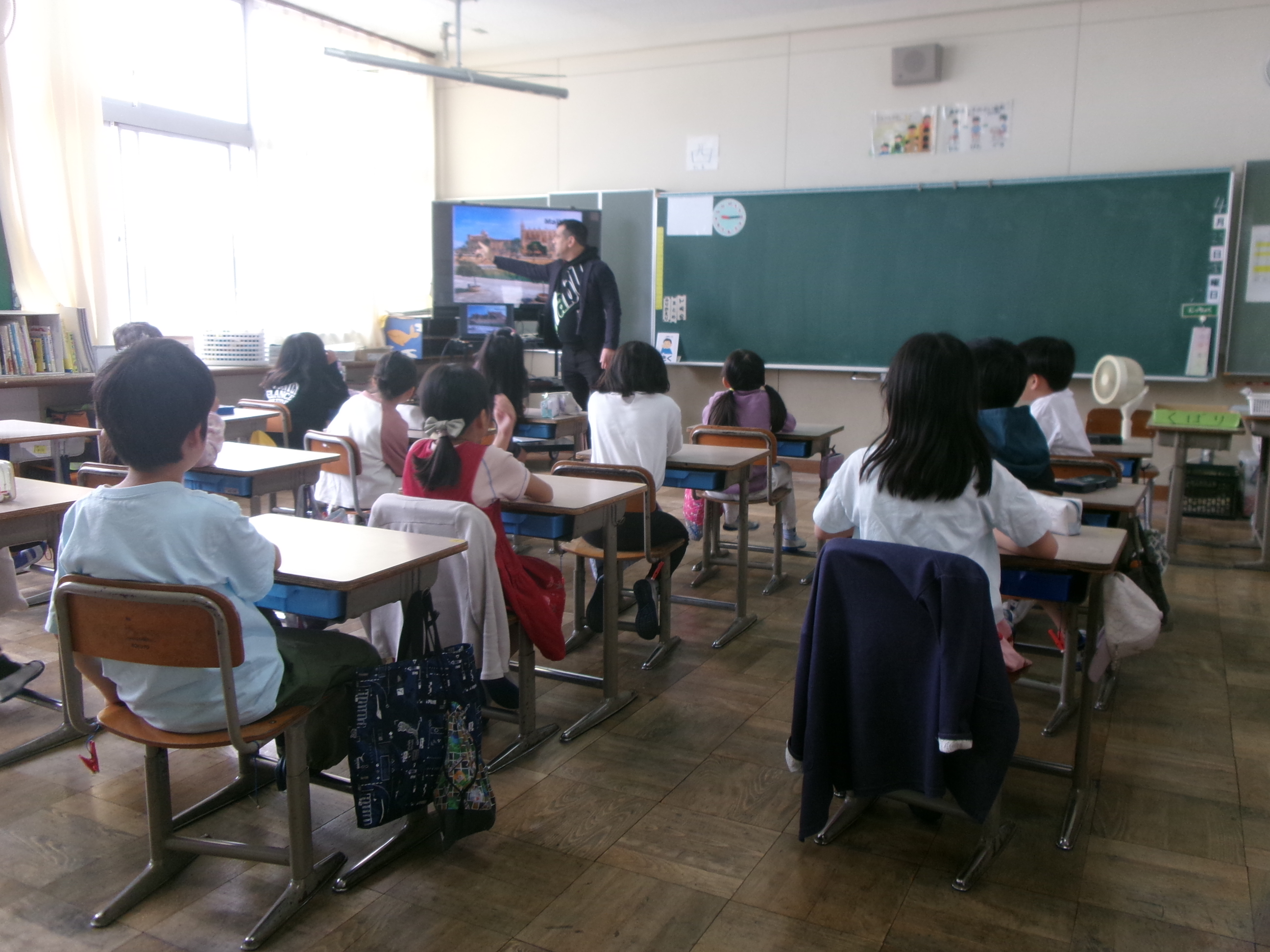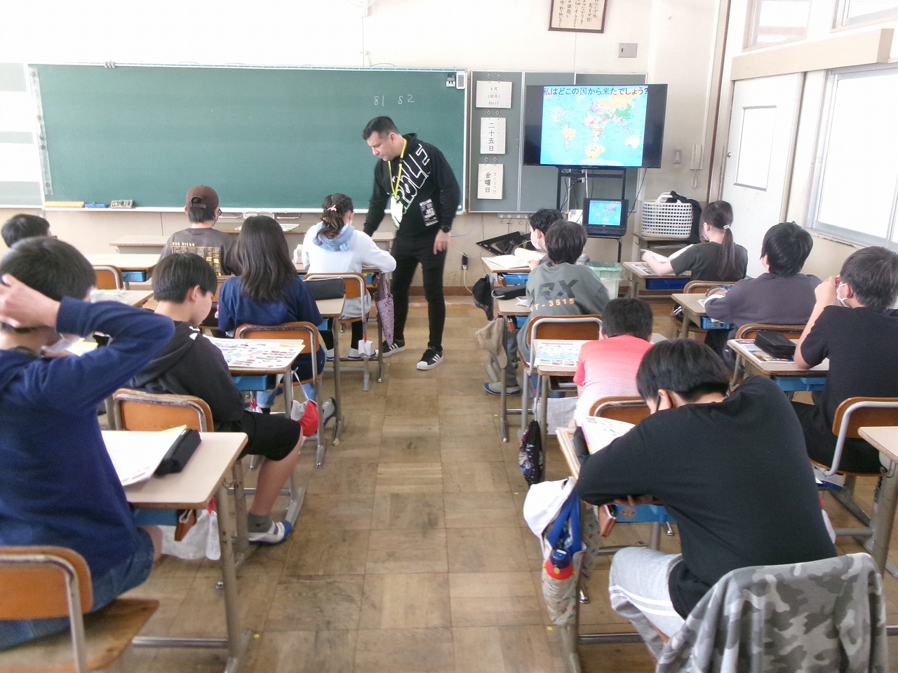 今日からALTの先生が来てくださり、本格的に外国語の学習が始まりました。今日は最初の時間ですので、ALTの自己紹介から始まりました。スペイン出身の先生で、出身地の写真を見せながら、子どもたちとやりとりをしていました。昼休みには運動場で子どもたちと一緒に遊ぶ姿も見られました。これから一年間、よろしくお願いします。
