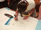 後半はグループに分かれてのグループ協議でした。テーマは「いじめをしている人へのメッセージ」「いじめられている人へのメッセージ」「いじめを見ている人へのメッセージ」の3つでした。ひとグループ6〜7人で、みんな違う学校です。自分のグループに割り当てられたテーマで話し合いました。初めて出会う人との話し合い。真野北小の子どもたちはどうだろうかと思って見ていました。グループ協議が始まると、大丈夫だろうかとの心配を吹き飛ばす活躍ぶりで、何度も手を挙げ自分の考えを話したり、身を乗り出して仲間の意見を聞いたり、最後に各グループのまとめを発表する役に立候補したり。大活躍の子どもたちでした。
