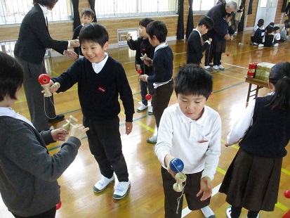 1年生が生活科の学習で昔遊びを行いました。